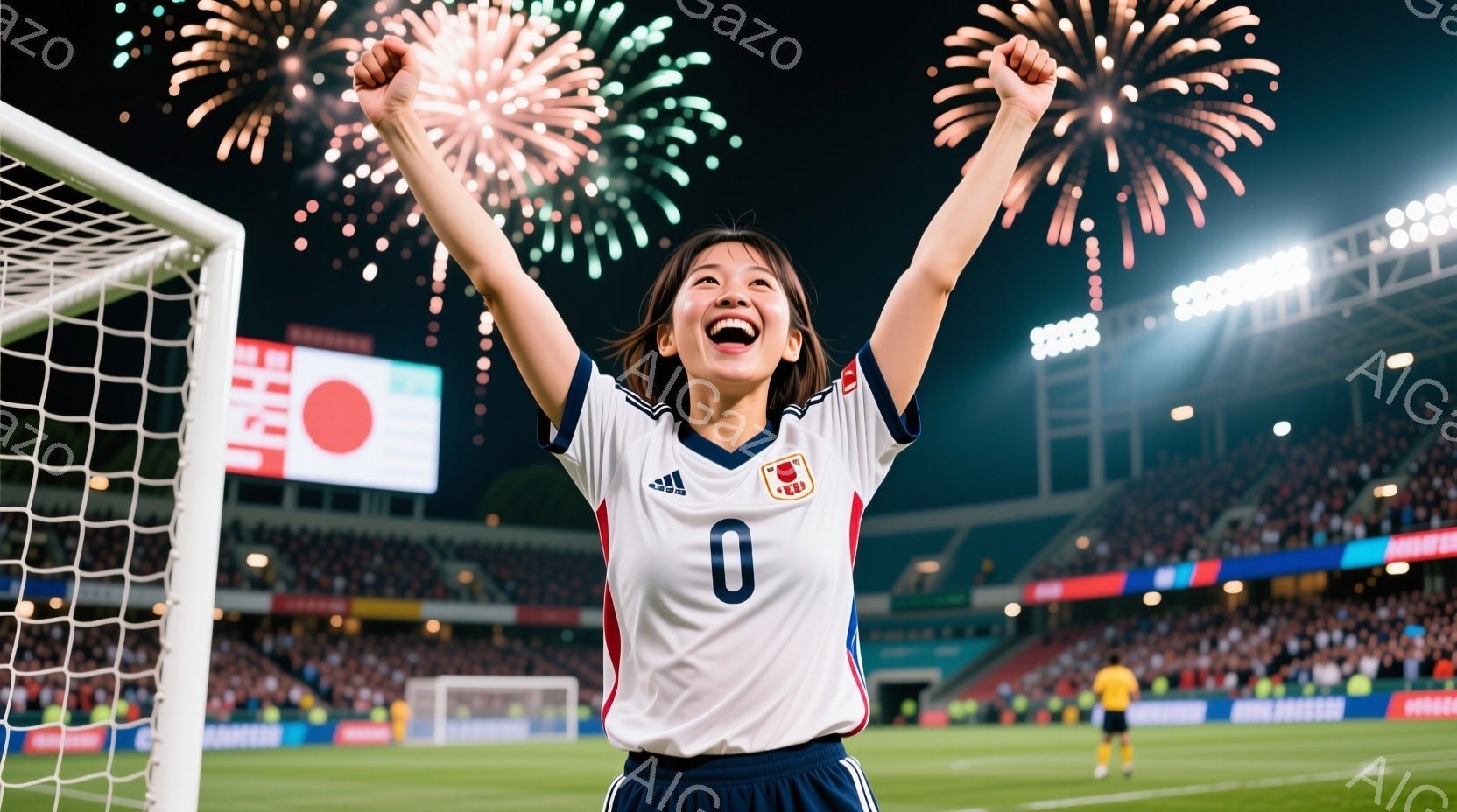 サッカーユニフォームを着た若い女性が、両手を高く上げて歓喜しています。彼女は黒髪で、笑顔が印象的です。背景には満員のスタジアム、サッカーボール、そして夜空に打ち上げられた花火が見え、勝利の興奮と祝祭の雰囲気を表現しています。