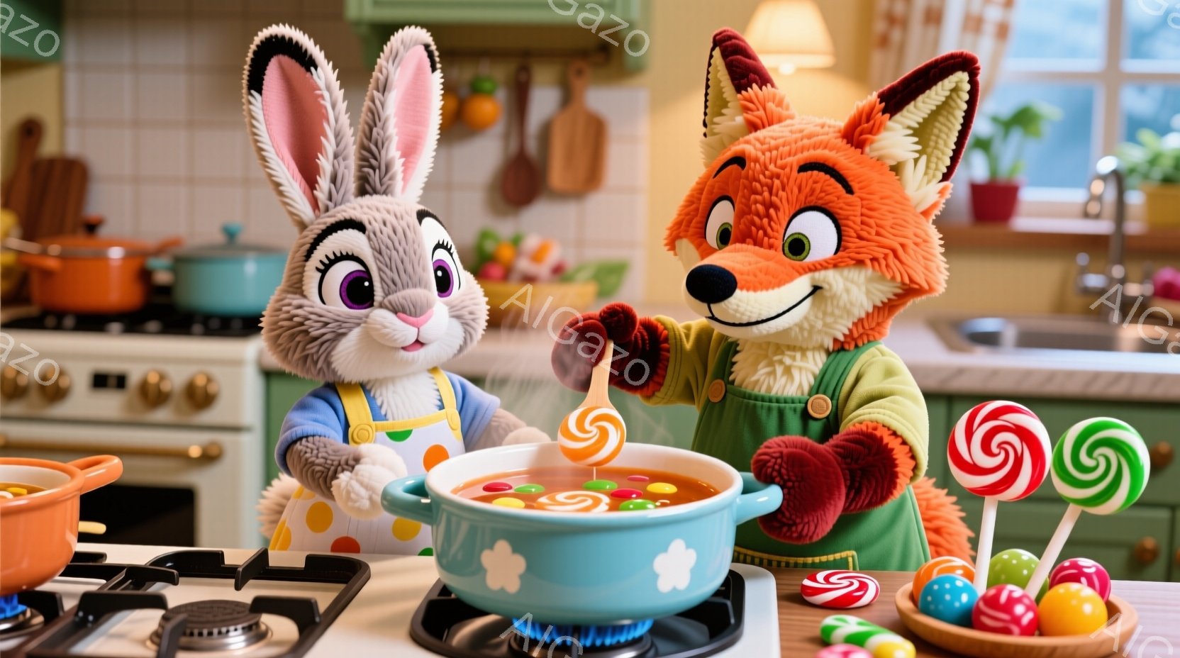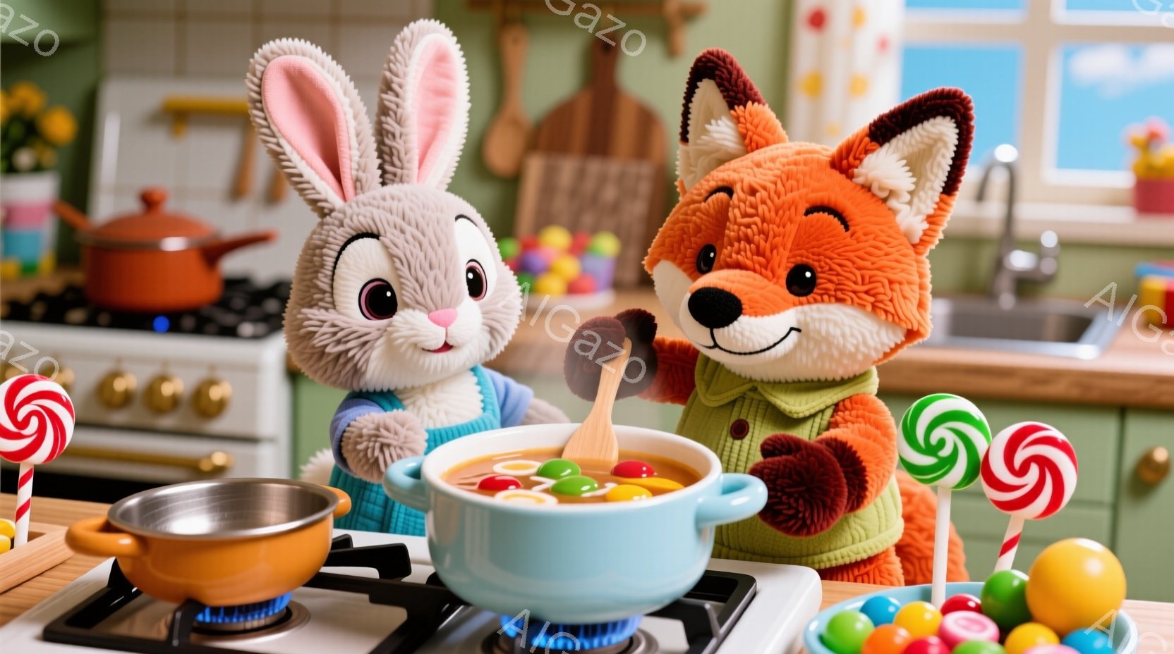 白いウサギとオレンジ色のキツネが、エプロンを着て、キッチンで鍋を囲んでいます。ウサギは左手で鍋の取っ手を、キツネは右手で鍋の取っ手を掴み、鍋の中にはカラフルなキャンディが入ったスープが入っています。背景にはキャンディの飾り、フルーツ、調理器具が並び、全体的に明るく楽しい雰囲気です。