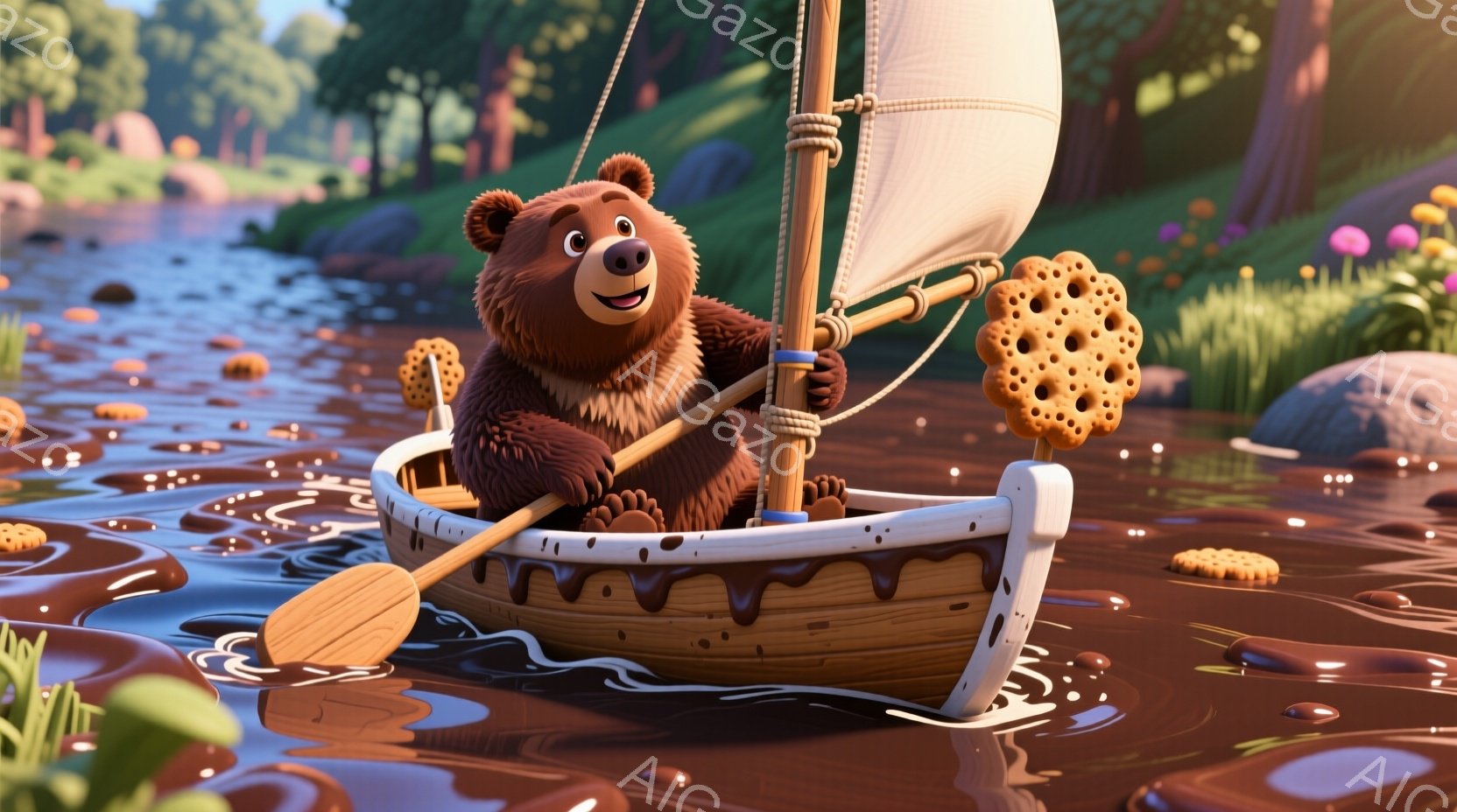 茶色のクマが、ビスケットで作られたボートに乗って川を航行しています。クマは片手にオールを持ち、楽しそうな表情を浮かべています。背景には緑豊かな森林と、花が咲き乱れる風景が広がり、穏やかで陽気な雰囲気を醸し出しています。