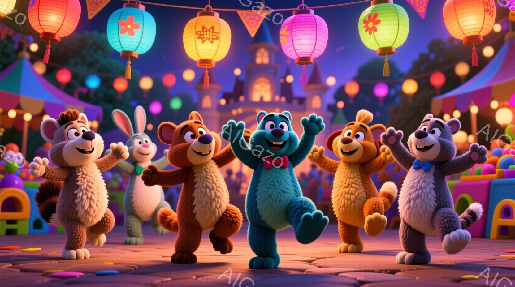 明るい夜の街並みを背景に、人型の動物たちが楽しそうに踊っています。茶色、オレンジ、白、青の毛並みのキャラクターたちは、それぞれ異なる色のリボンやアクセサリーを身につけ、満面の笑みを浮かべて腕を上げたり、足を高く上げたりしています。背景には、提灯が飾られた建物や賑やかな市場が見え、全体的に陽気で活気のある雰囲気が漂っています。