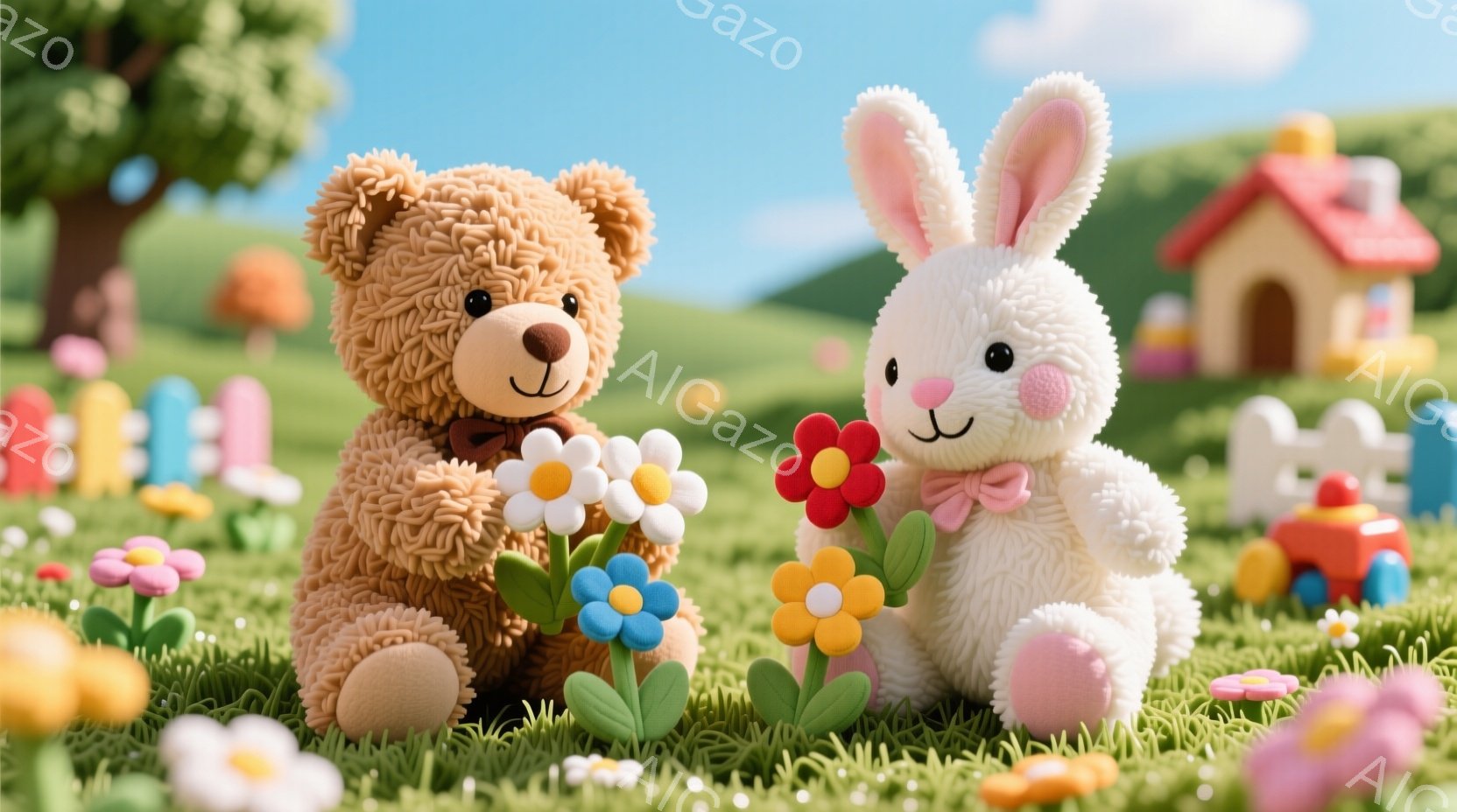 ふわふわのテディベアとウサギのぬいぐるみが、緑の草の上に座って花を持っています。テディベアは茶色のリボンで、ウサギはピンクのリボンで装飾されています。背景には、カラフルな家々や緑の丘、青い空が見え、暖かく穏やかな雰囲気を醸し出しています。