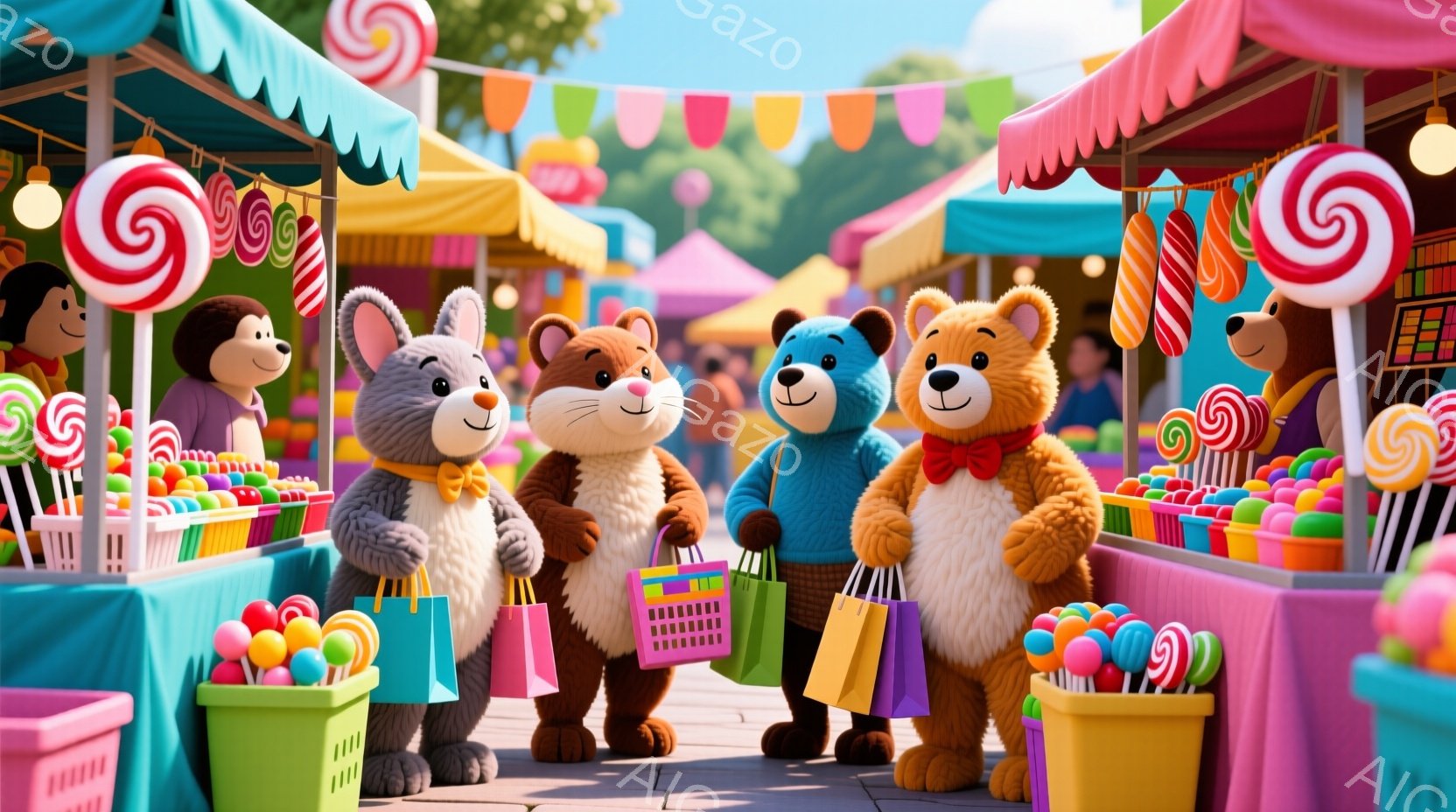 3匹のテディベアが、キャンディが並ぶ市場を歩いています。灰色のクマは紫色の服を着て、茶色のクマはオレンジ色の服を着て、明るい茶色のクマは黄色の服を着て、それぞれ買い物袋を持っています。背景にはカラフルなキャンディや甘いお菓子が並び、お祭りや楽しい雰囲気を醸し出しています。