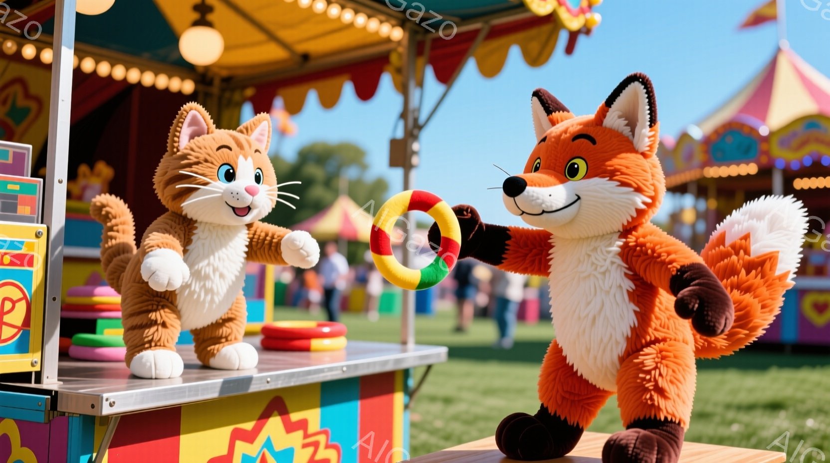 明るい遊園地の風景で、青い猫とオレンジ色の狐が遊具のカウンターの前で楽しそうに遊んでいます。猫は片手を上げて興奮気味な表情を浮かべ、狐は赤いリングを掲げて猫に渡そうとしています。背景にはカラフルな屋台や青空、そして遊園地の賑やかな雰囲気が広がっており、全体的に陽気で楽しいムードが漂っています。