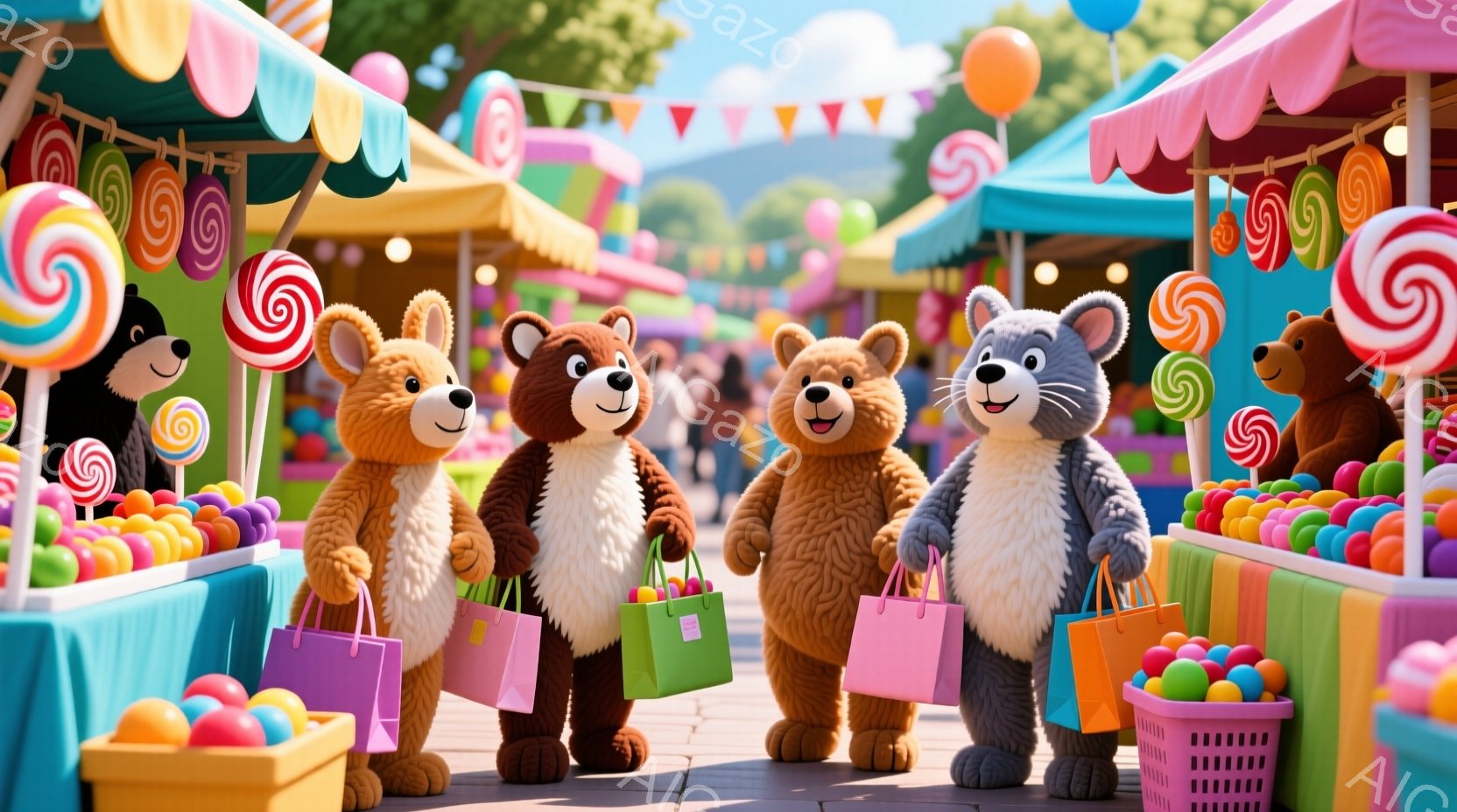 カラフルなキャンディーが並ぶ市場で買い物をしている3匹のテディベアがいます。黒いクマはオレンジ色のショッピングバッグ、茶色のクマはピンク色のバケツを持っており、それぞれキャンディーを購入したようです。背景には、さらに多くのキャンディーやテディベアの置物があり、明るく楽しいお祭りのような雰囲気が漂っています。