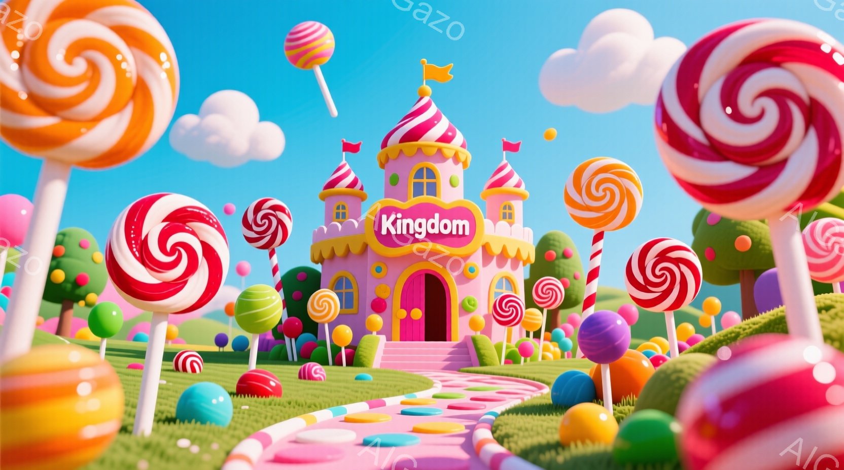 カラフルなキャンディが至る所に散りばめられた夢のような風景です。ピンク色の可愛らしいお城が中央に位置し、緑の芝生と様々な色のキャンディが並ぶ道がその手前に広がっています。空には綿菓子のような雲が浮かび、全体的に明るく甘い雰囲気が漂っています。
