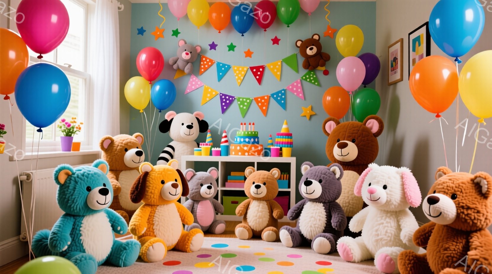 この無料AI生成画像「鮮やかな緑色の壁を背景に、たくさんのテディベアがお祝いのテーブルを囲んで座っています。テーブルの上にはケーキとカラフルなカップケーキが並び、背景には「HAPPY」と書かれた金色のバナーと、カラフルな三角形のガーランドが飾られています。全体的に明るく、お祝いムードに満ちた、子供の誕生日パーティーのようです。」は、2025年10月26日に作成されました。 サイズは 1664×928px の高解像度で、商用利用も可能なフリー素材として提供しています。