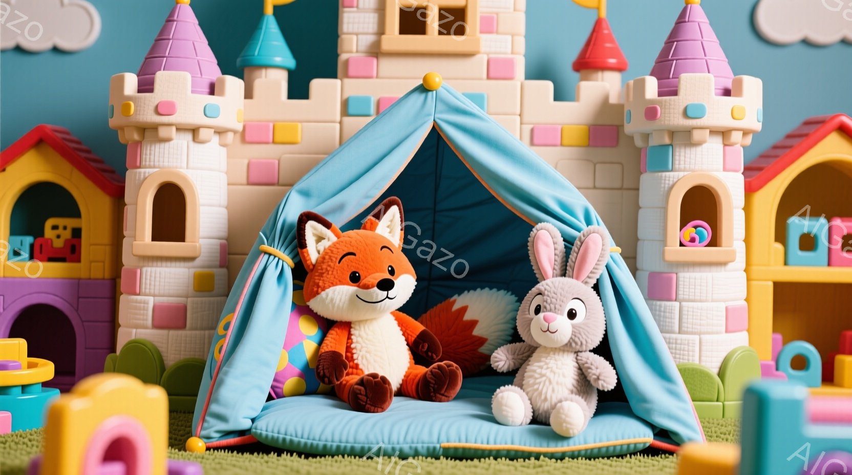 明るい緑の芝生の上に、お城のようなプラスチックのおもちゃが並び、その中にオレンジ色のキツネのぬいぐるみと白いウサギのぬいぐるみが座っています。キツネは緑のセーターを着ており、ウサギはピンクの蝶ネクタイを付けており、どちらも穏やかな表情をしています。全体的に、可愛らしく、夢のような雰囲気の、子供向けの遊び空間を写した画像です。