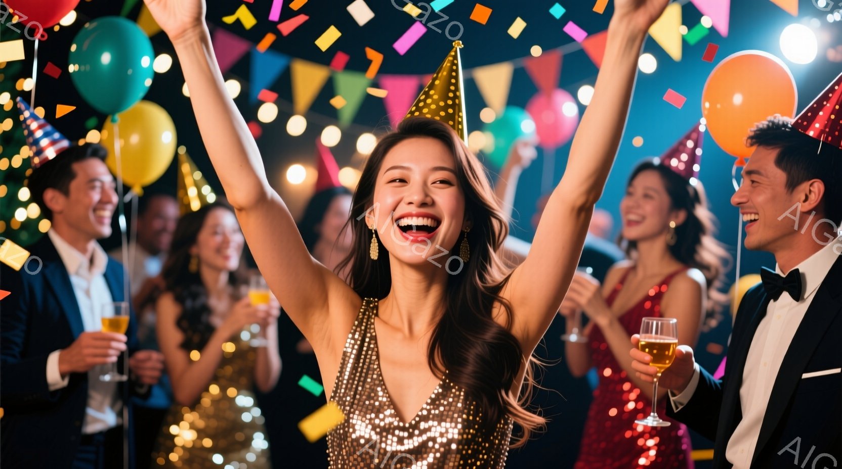 パーティーを楽しむ人々が写っています。人々は華やかなドレスやスーツを着ており、顔には笑顔が溢れています。背景にはカラフルなリボンや風船、そしてライトがあり、お祝いの雰囲気を高めています。