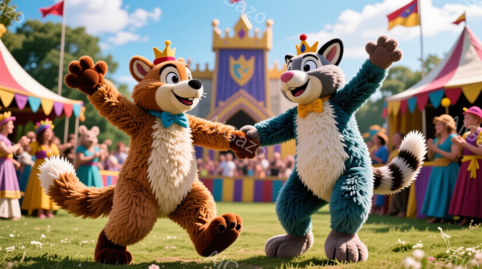2匹の動物のキャラクターが手をつないで、楽しそうに跳ねています。彼らはそれぞれ、王冠とメダルのついた青いマントを羽織っており、満面の笑みを浮かべています。背景には、カラフルなテントや衣装を着た人々がおり、お城のような建物が見え、晴れた空の下、お祭り騒ぎのような活気のある雰囲気が漂っています。
