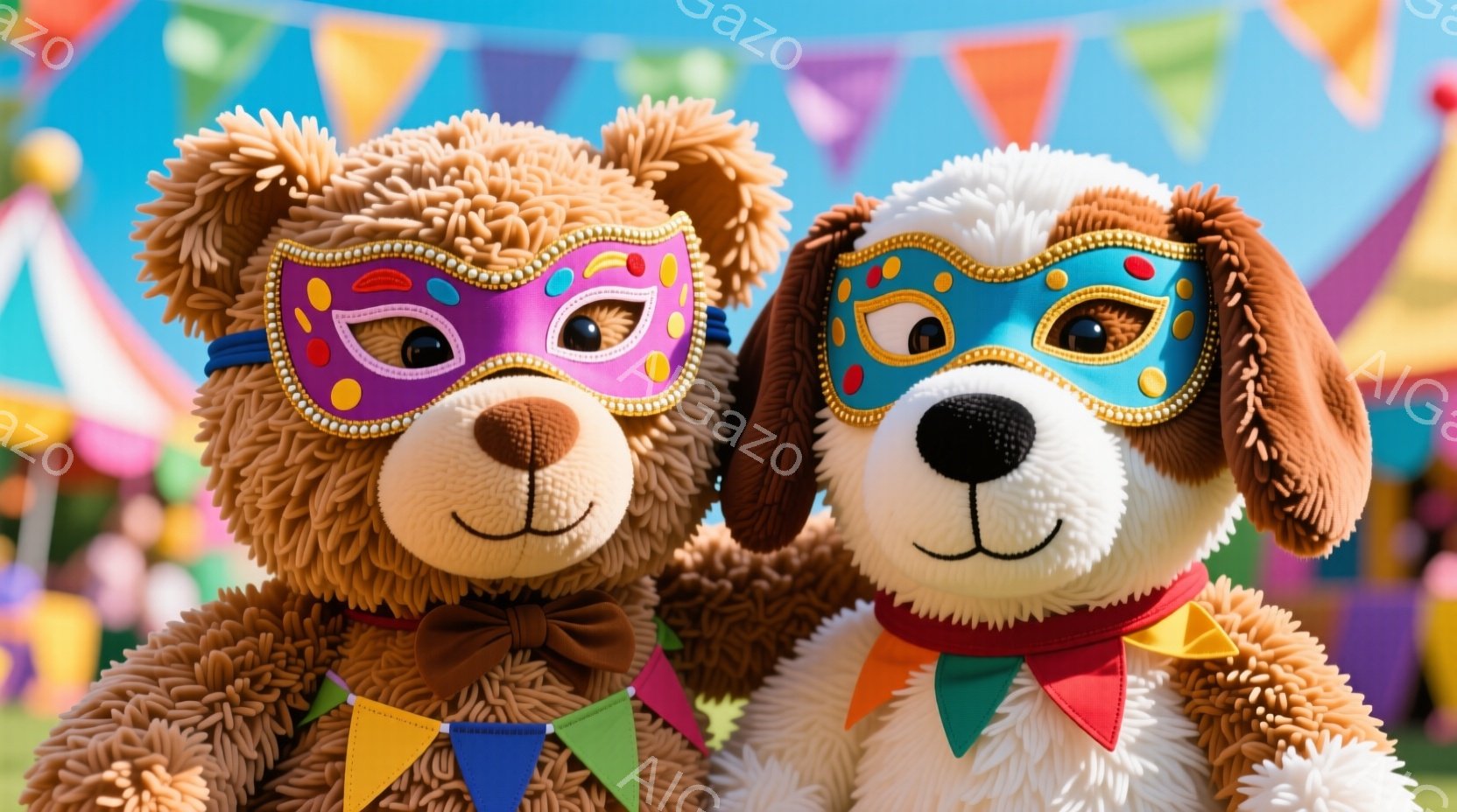 この無料AI生成画像「2匹の大きなクマのキャラクターが芝生の公園で手をつないで踊っています。片方のクマは茶色で青いリボン、もう片方は青色で赤いリボンをつけており、どちらも楽しそうな表情をしています。背景にはお城のような建物やカラフルなテント、人々がおり、晴れた空の下、お祭りやイベントのような華やかな雰囲気です。」は、2025年10月26日に作成されました。 サイズは 1664×928px の高解像度で、商用利用も可能なフリー素材として提供しています。