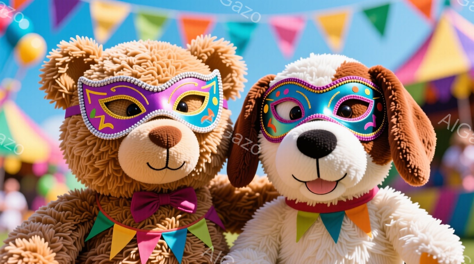 ぬいぐるみである茶色の熊とクリーム色の犬が並んで立っており、それぞれ紫と青の仮面をつけています。熊は赤いリボンを結び、犬はカラフルなスカーフを首に巻いており、お祭りかイベントの賑やかな背景がぼやけて見えます。全体的に、陽気で遊び心のある雰囲気で、楽しい時間を示唆しています。