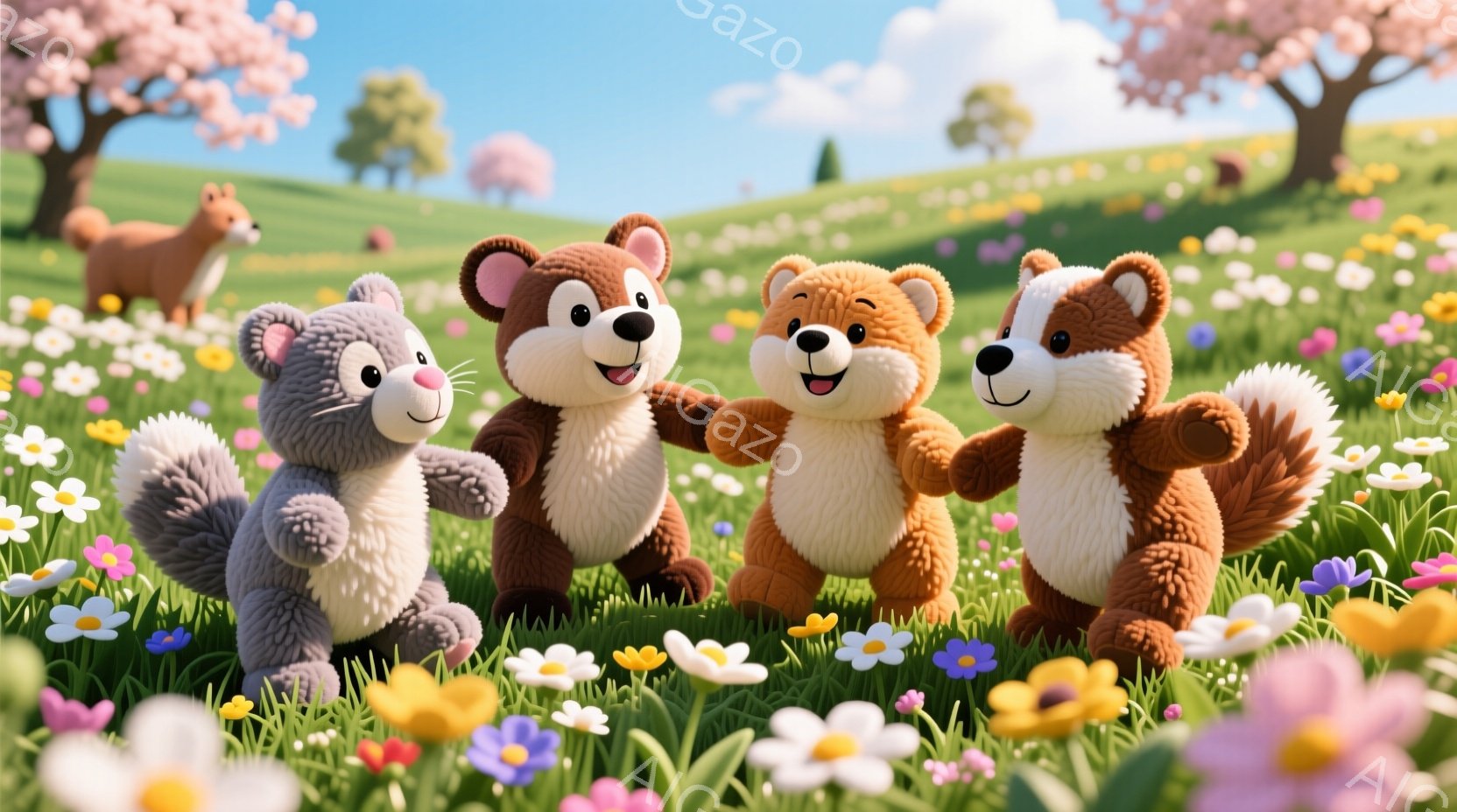 ふわふわとした質感のリスのキャラクターが四匹、花盛りの草原を駆け回っています。それぞれのリスは異なる毛色で、明るい表情で楽しそうに走っています。背景にはピンク色の桜の木が咲き、青空の下、暖かい春の陽気が感じられる、可愛らしく平和な雰囲気です。