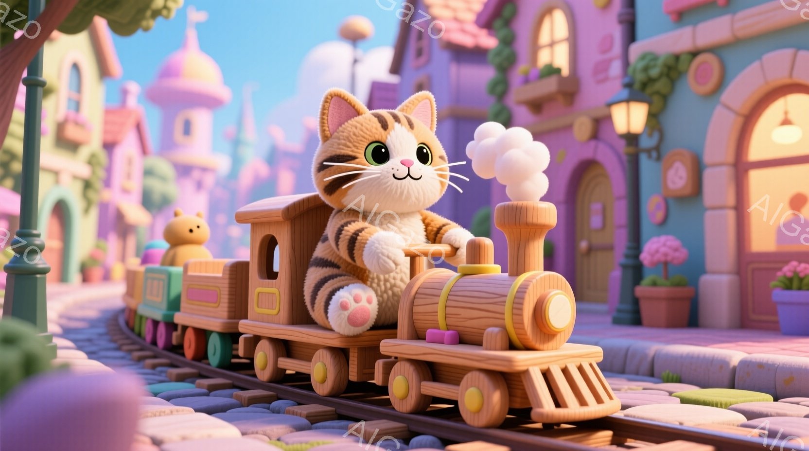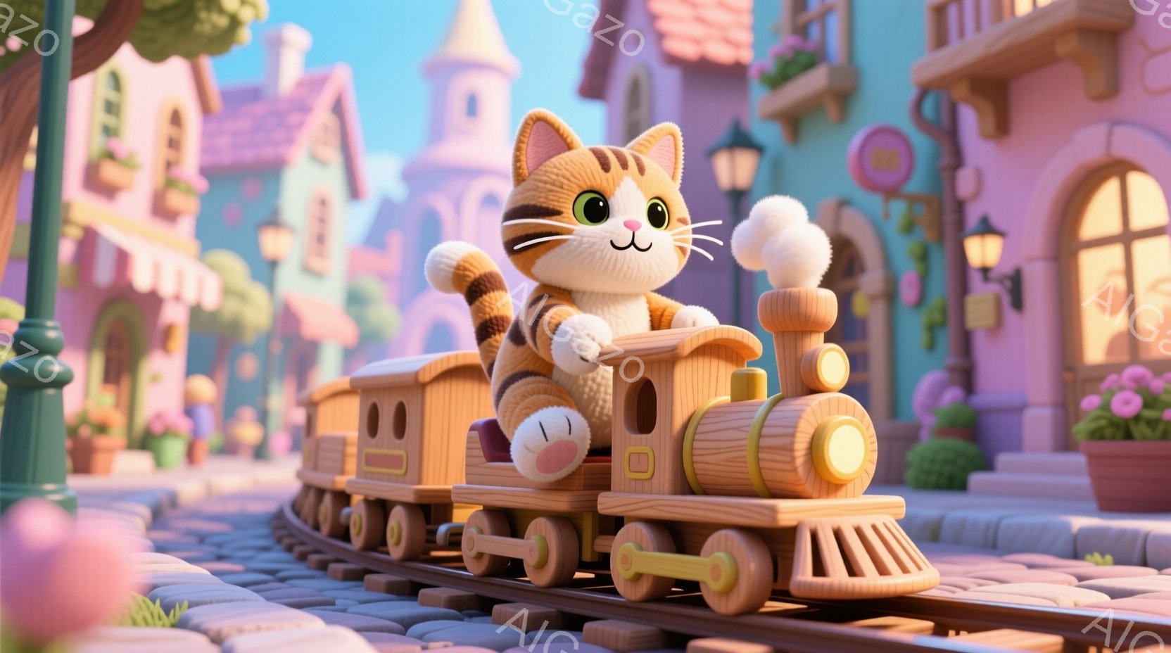 明るい色彩で描かれた、かわいらしい猫が蒸気機関車の運転手をしている様子が描かれています。猫はクリーム色の毛並みで、ピンク色の小さな手袋と靴を履き、笑顔で運転席から手を振っています。背景には、パステルカラーの建物が並び、花壇や木々が彩り豊かに配置され、暖かく夢のような雰囲気を作り出しています。