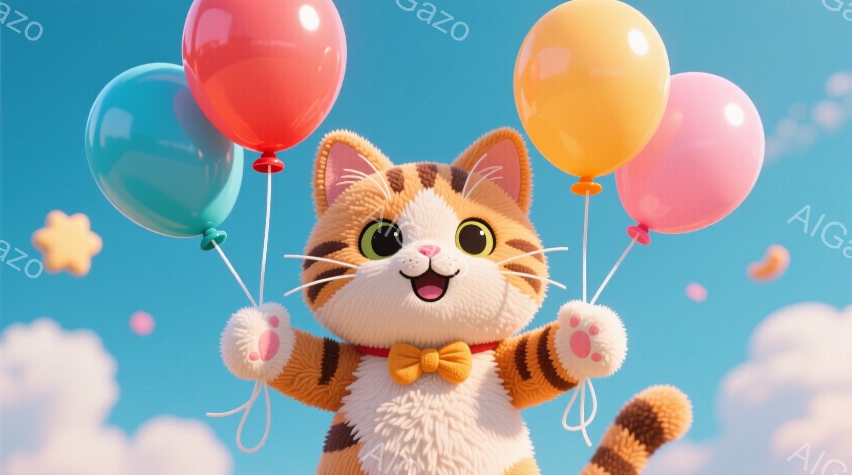 この無料AI生成画像「明るい青空を背景に、オレンジと白の縞模様の猫が浮かんでいるように見えます。猫は両手を高く上げて、赤、青、黄、緑の風船を握り、嬉しそうな笑顔を浮かべています。背景には白い雲と、ぼんやりと見える花が咲く緑の草地があり、全体的に陽気で楽しい雰囲気が漂っています。」は、2025年10月26日に作成されました。 サイズは 1664×928px の高解像度で、商用利用も可能なフリー素材として提供しています。