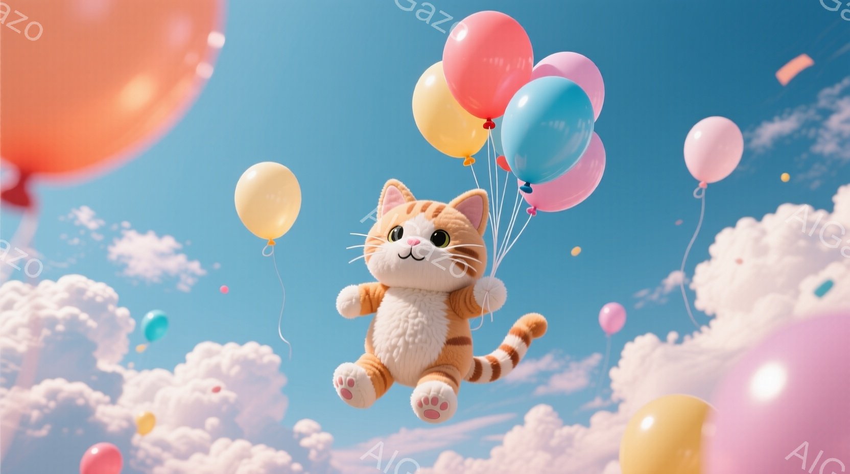 鮮やかな青空を背景に、オレンジ色の縞模様の猫が風船に吊り下げて空を飛んでいます。猫は小さな蝶ネクタイを付けており、幸せそうな表情をしています。周りには、ピンク、オレンジ、水色の風船やキラキラした紙吹雪が舞い、夢のような、陽気な雰囲気を醸し出しています。