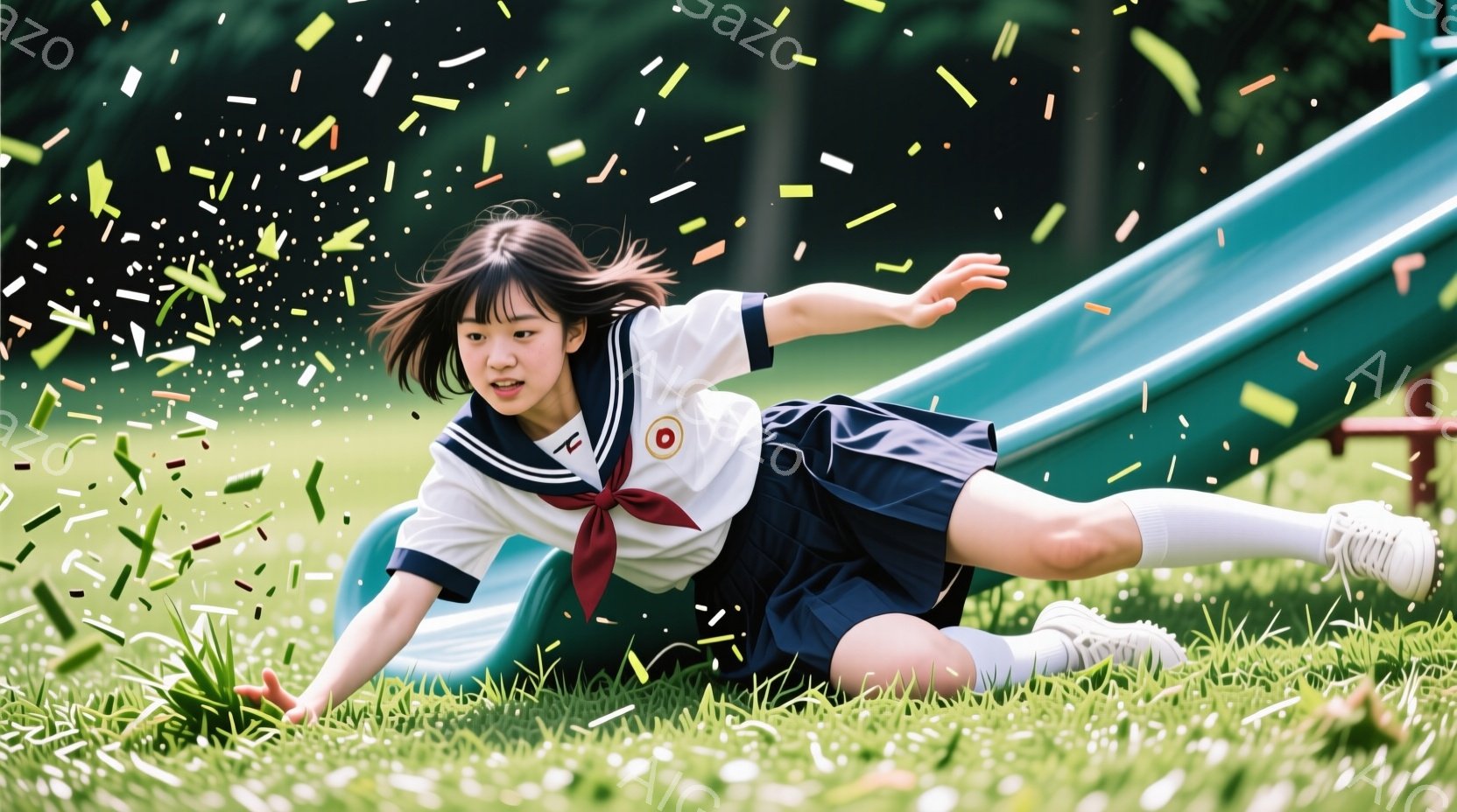 二人の少女が緑色の滑り台から滑り降りる瞬間を捉えた写真です。制服姿で、髪は肩までの長さで、滑る風になびいています。背景には緑豊かな草地が広がり、まるで桜の花びらが舞っているかのような幻想的な雰囲気です。