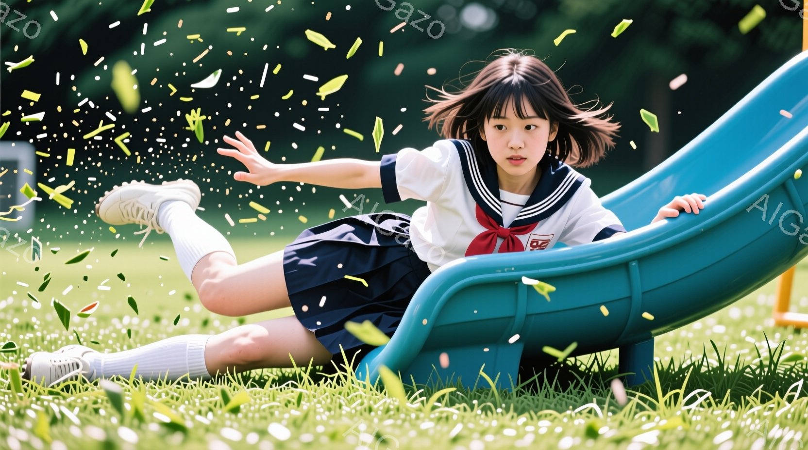 青い滑り台の横に座っている、制服を着た若い女の子が写っています。彼女は濃い青色のスカートと白いブラウスを着ており、髪は肩まで伸びており、顔は少し横を向いています。背景には緑豊かな草が生い茂り、晴天で柔らかい光が差し込んでおり、全体的に明るく、のどかな雰囲気です。
