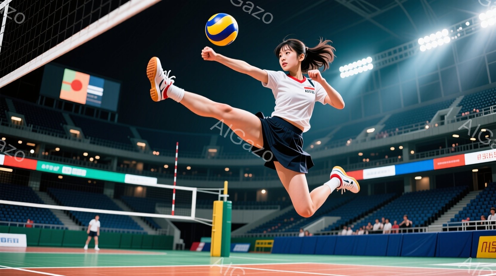 バレーボール選手と思われる女性が、競技場で空中でキックのような動作をしています。白い半袖シャツと紺色のショートパンツを着用し、髪はポニーテールに結ばれています。背景には観客席が広がり、競技場全体が明るく照らされています。