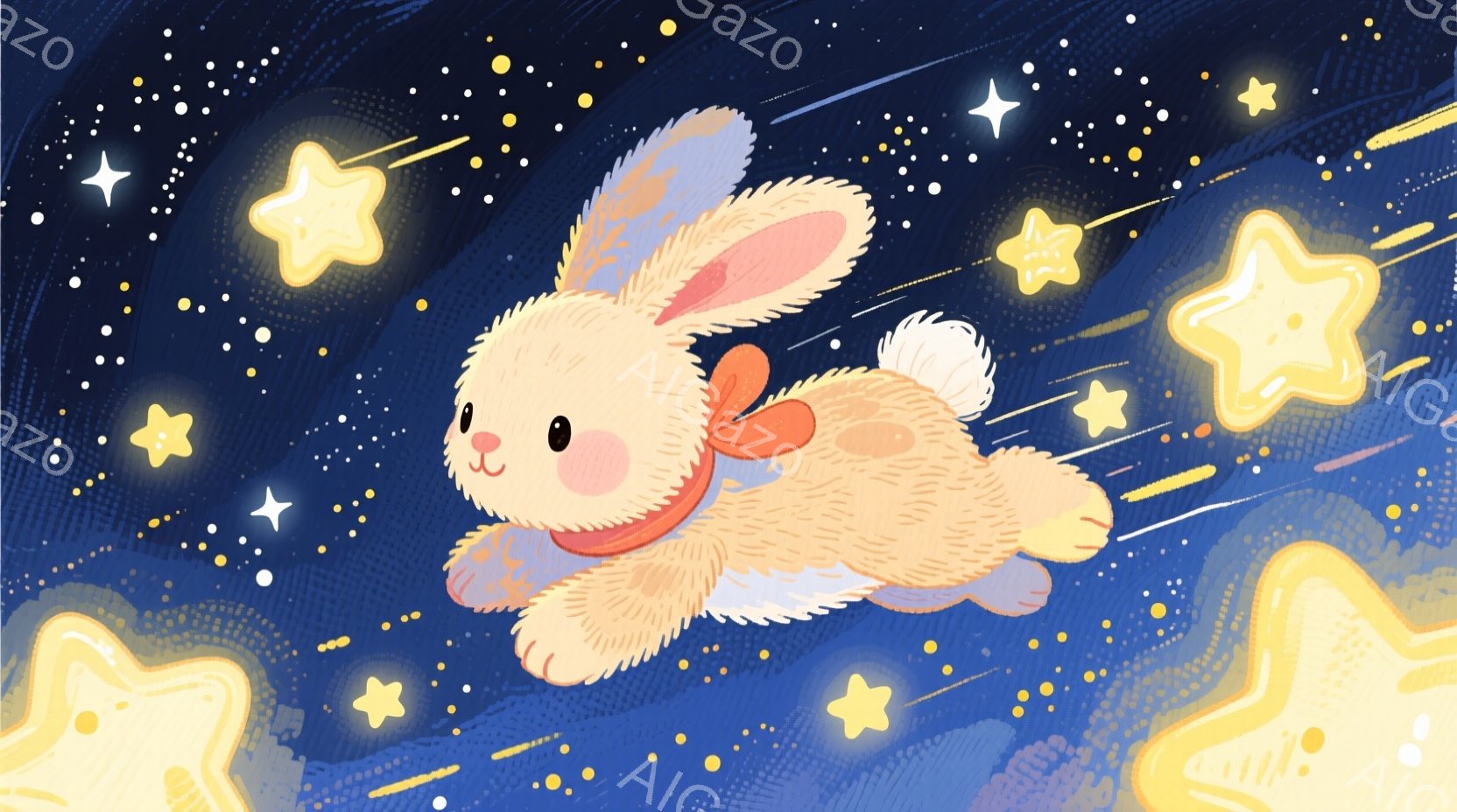 明るい青色の背景に、ふわふわのクリーム色のウサギが描かれています。ウサギは小さな青いスカーフを首に巻き、楽しそうに空を飛んでいます。周りにはキラキラと輝く星や、ぼんやりとした月の光が散りばめられ、幻想的な雰囲気を醸し出しています。