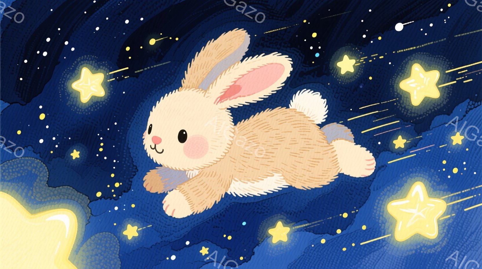 星空を背景に、ふわふわとした茶色のうさぎが空を飛んでいる様子を描いています。うさぎは短い足で空を蹴りながら、嬉しそうな表情で前方を向いています。背景には様々な大きさの黄色い星が散りばめられ、明るく幻想的な雰囲気を作り出しています。