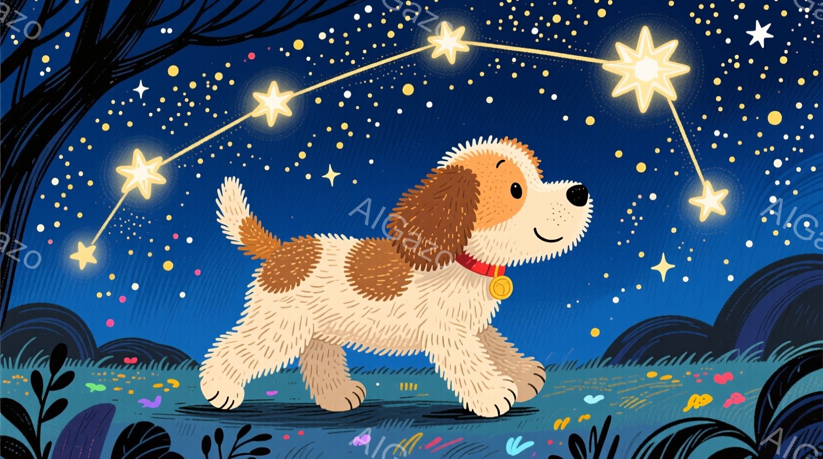 明るい青色の背景に、ふわふわのクリーム色の毛並みを持つ子犬が描かれています。子犬は赤い首輪をつけており、楽しそうに草の上を走り、顔には嬉しそうな表情が浮かんでいます。背景には星が輝き、緑の草や花が咲き誇り、子犬の周囲を明るく照らしています。