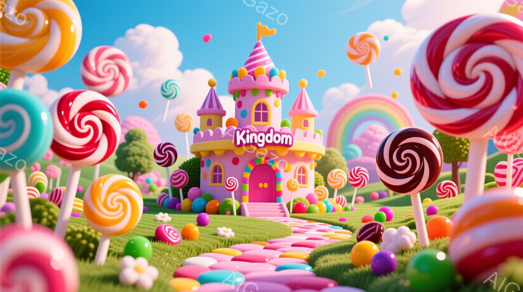 カラフルなキャンディーが並ぶ、夢のような風景が広がっています。ピンク色の可愛らしいお城が中央に位置し、緑の芝生の上をキャンディーの道が伸びています。空は晴れており、ふわふわの雲が浮かび、全体的に明るく、お菓子の国のような甘い雰囲気が漂っています。