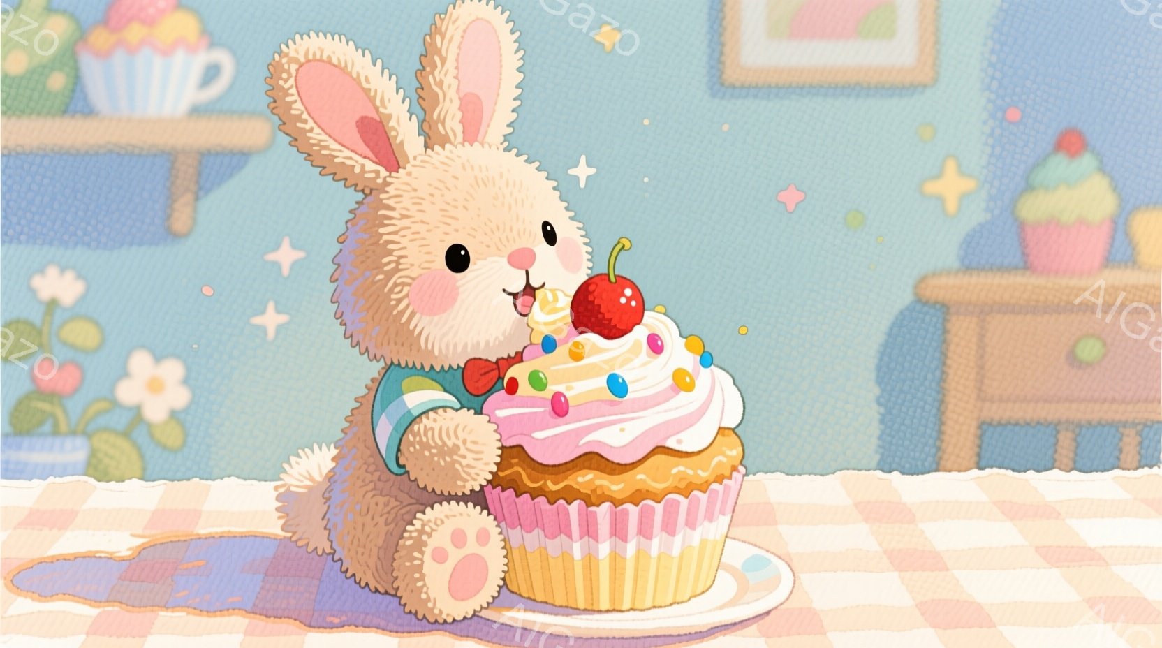 明るいピンク色のチェック柄のテーブルクロスの上に、大きなクリームとカラフルなスプリンクル、そして赤いチェリーが飾られたカップケーキが置かれています。ふわふわの茶色のうさぎが、片足を上げて、そのカップケーキを美味しそうに頬張ろうとしています。背景は淡い色調で、椅子がわずかに見え、全体的に温かく、可愛らしい雰囲気です。