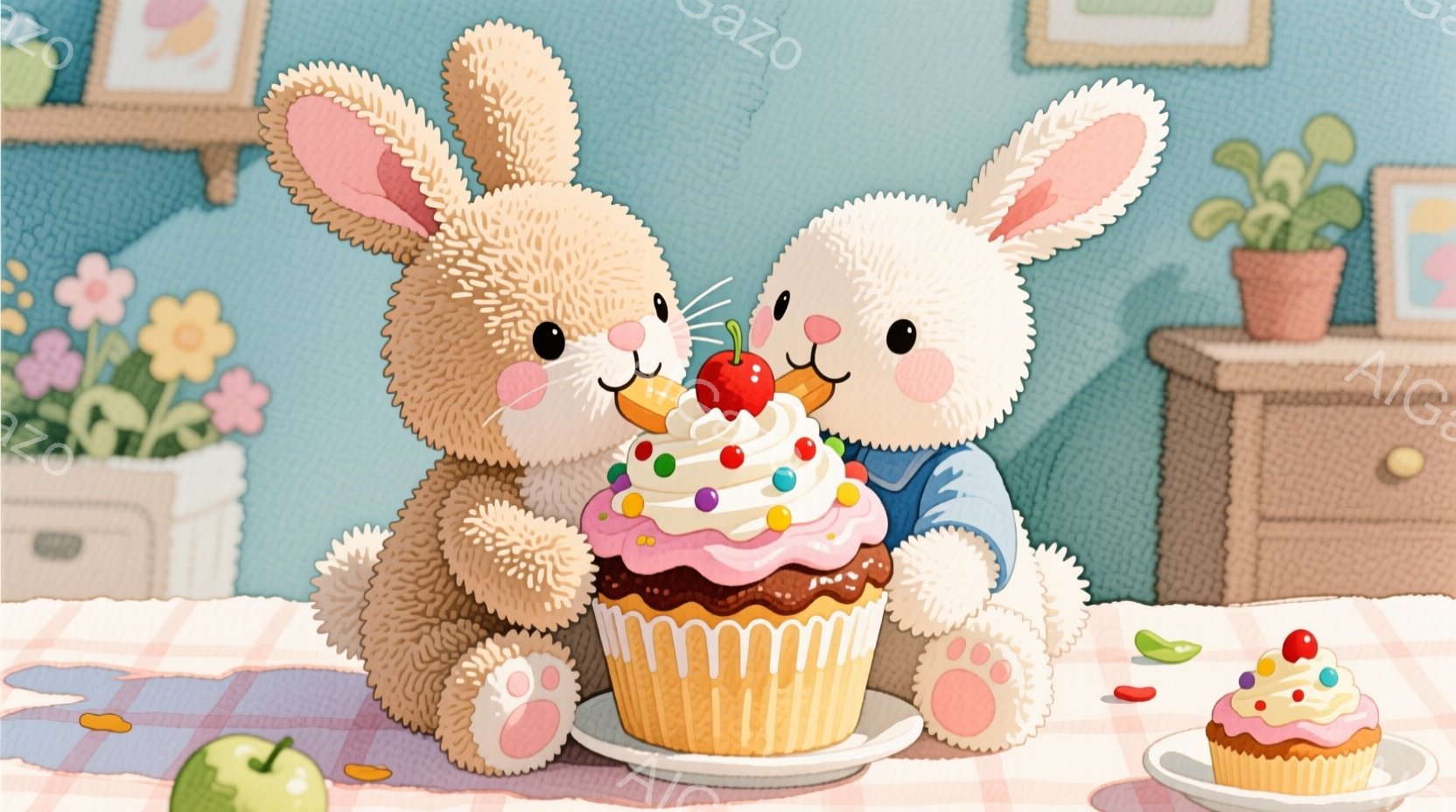 ふわふわの毛並みを持つ子ウサギが、クリームとイチゴ、そして火のついたキャンドルが飾られた大きなカップケーキを見つめています。ウサギは片足を上げて好奇心と期待に満ちた表情で、まるで誕生日のお祝いを待っているかのようです。背景には、パステルカラーのテーブルクロス、他のデザート、そして可愛らしい装飾が施された部屋の一部がぼんやりと見え、温かく幸せな雰囲気を醸し出しています。