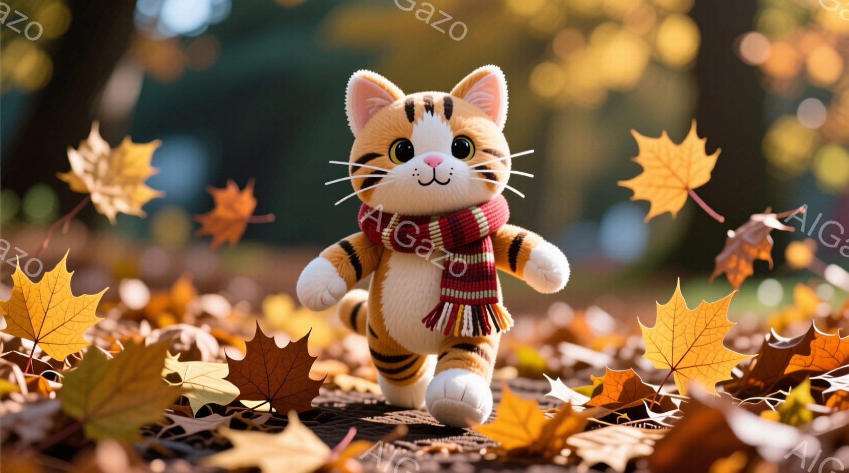 鮮やかなオレンジ色の紅葉が散りばめられた背景の中、クリーム色と茶色の縞模様の猫が描かれている。猫は赤いスカーフを首に巻き、前足を前に出して歩いている様子で、丸い目に優しい表情をしている。背景は秋の森で、暖かく穏やかな雰囲気を醸し出している。