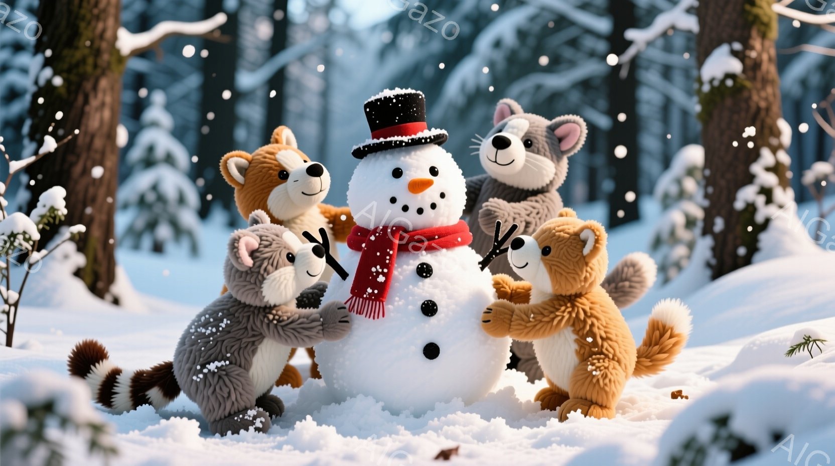 雪景色の中で、可愛らしいクマたちが雪だるまを囲んでいます。クマたちはそれぞれ異なる色のセーターを着ており、満面の笑みを浮かべて雪だるまと触れ合っています。背景には雪に覆われた木々が立ち並び、温かく幸せな冬の雰囲気が漂っています。