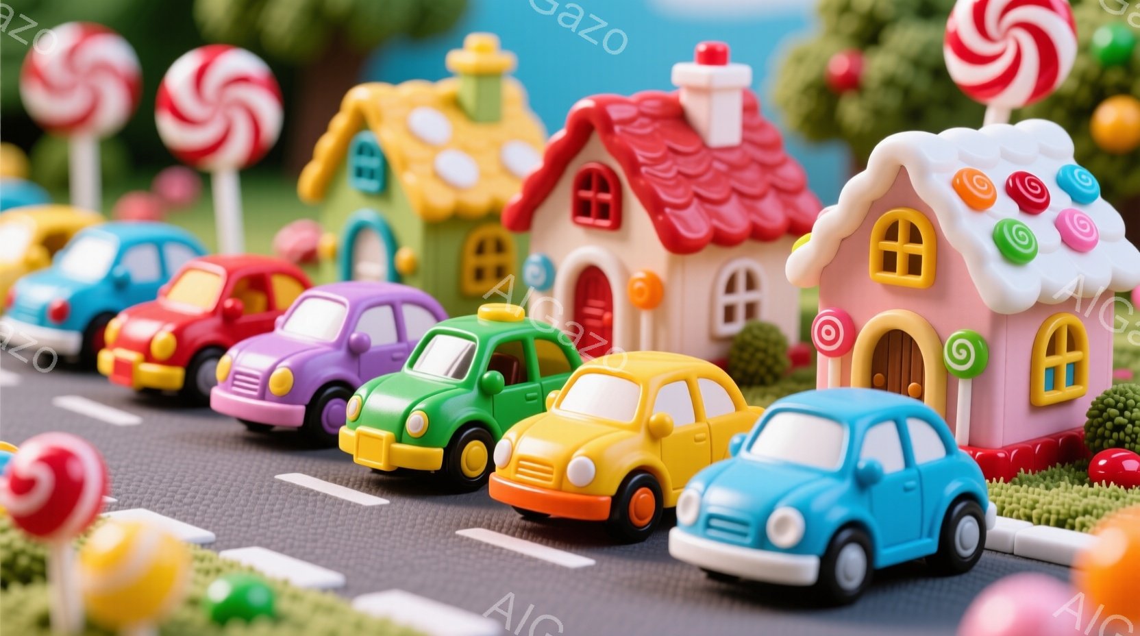カラフルなミニチュアの街並みに、レトロな青い車が佇んでいます。建物はパステルカラーで可愛らしく装飾され、街路樹や花壇が彩りを添えています。暖かく穏やかな雰囲気が漂い、まるで絵本の中の世界のようです。