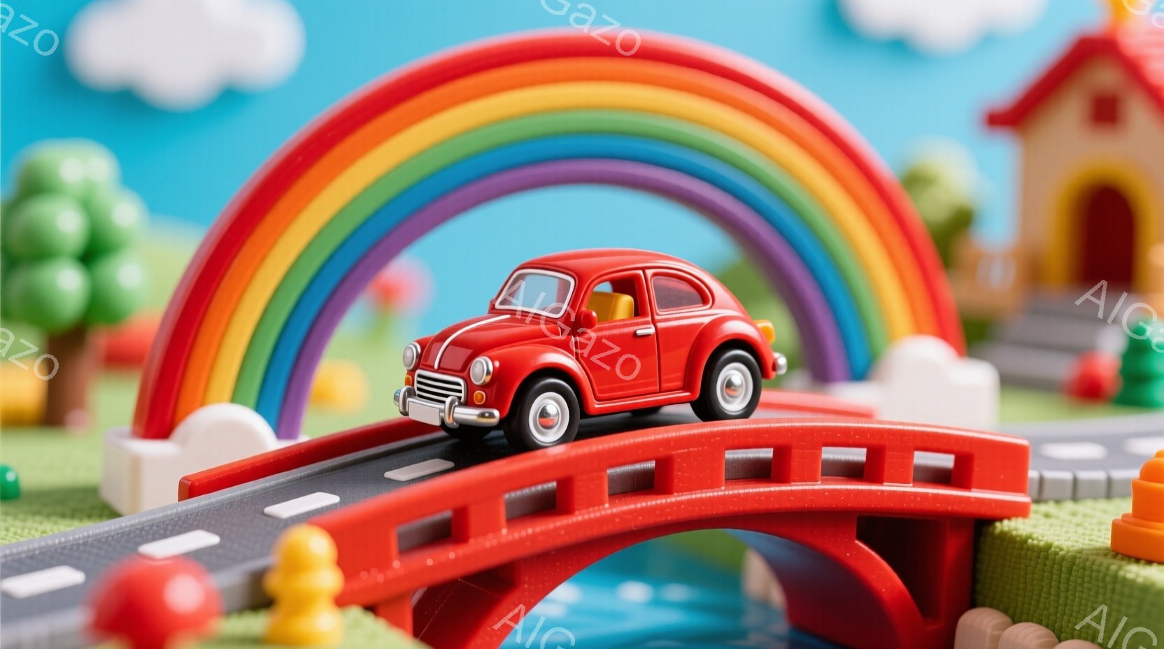 プラモデルの世界を表しています。中心には赤いクラシックカーが見られ、その後ろには鮮やかな虹が描かれており、橋を渡るように自動車が進んでいます。 周囲にはミニチュア的な建物と樹木があり、全体として楽しみや創造性を感じさせる雰囲気を持っています。