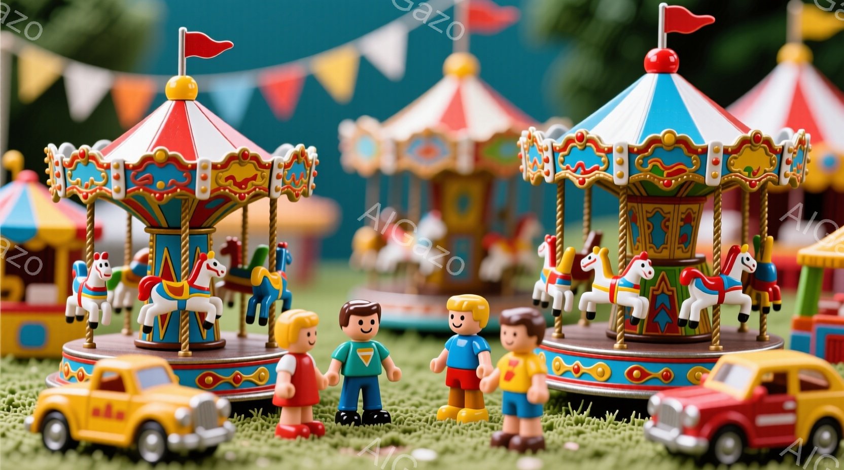 カラフルな遊園地の様子が描かれています。人々はシンプルで可愛らしい服装で、メリーゴーラウンドを楽しんでいます。背景には、赤い縞模様のテントとレトロな車が並び、明るく陽気な雰囲気を醸し出しています。