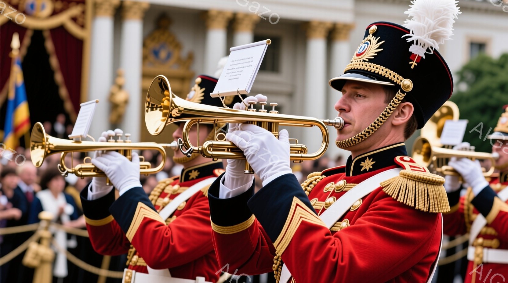 この無料AI生成画像「真っ黒な制服に金色の縁取りが施された軍服を着た男性たちが、トランペットを演奏しています。赤いベレー帽には白い飾り羽がついており、姿勢は非常に正しく、顔つきは真剣です。背景には、柱が並ぶクラシカルな建物が見え、晴天の下、華やかで格式高い雰囲気が漂っています。」は、2025年10月26日に作成されました。 サイズは 1664×928px の高解像度で、商用利用も可能なフリー素材として提供しています。
