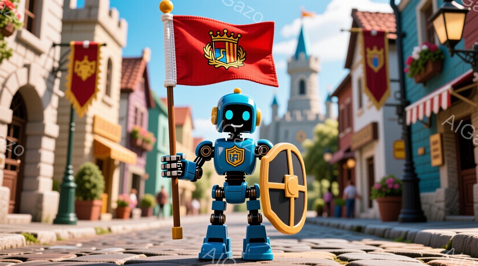 白を基調としたロボットが、赤い旗を高く掲げて立っている。背景には、中世ヨーロッパ風の建物が並び、石畳の道が続いている。全体的に明るく、おとぎ話のような雰囲気で、ロボットはどこか誇らしげに見える。