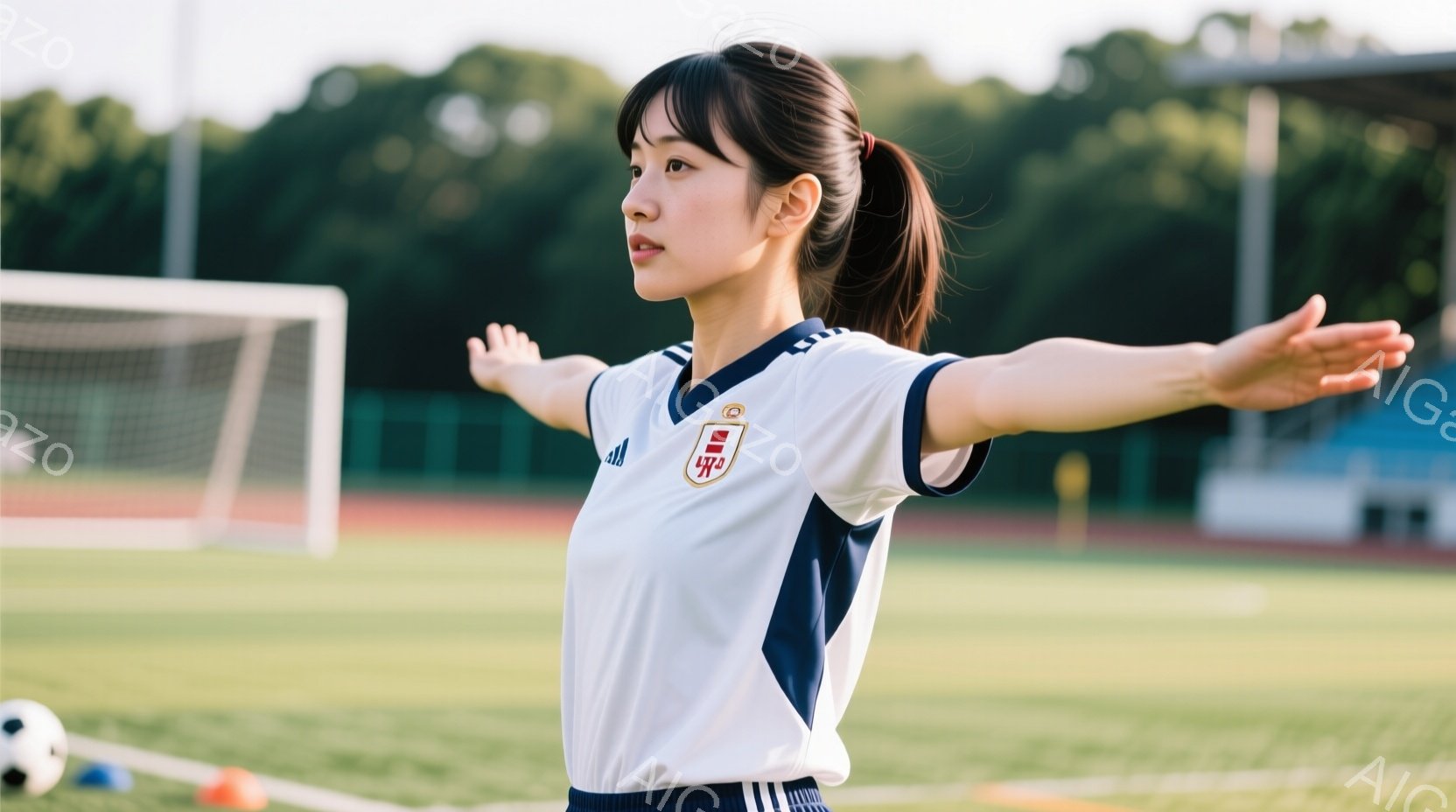 白いサッカーユニフォームを着た若い女性が、両腕を広げて立っています。彼女はポニーテールで髪をまとめ、表情はリラックスしており、背景には緑のサッカー場と遠くにぼやけた人物、そしてオレンジ色のコーンが点在しています。全体的に晴れた日の穏やかな雰囲気で、スポーツ活動の準備をしている様子が伺えます。