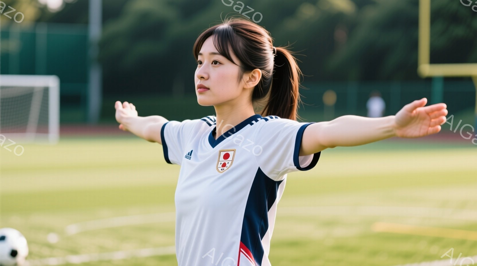 この無料AI生成画像「白いサッカーユニフォームを着た若い女性が、両腕を広げて立っています。彼女はポニーテールで髪をまとめ、表情はリラックスしており、背景には緑のサッカー場と遠くにぼやけた人物、そしてオレンジ色のコーンが点在しています。全体的に晴れた日の穏やかな雰囲気で、スポーツ活動の準備をしている様子が伺えます。」は、2025年10月22日に作成されました。 サイズは 1664×928px の高解像度で、商用利用も可能なフリー素材として提供しています。