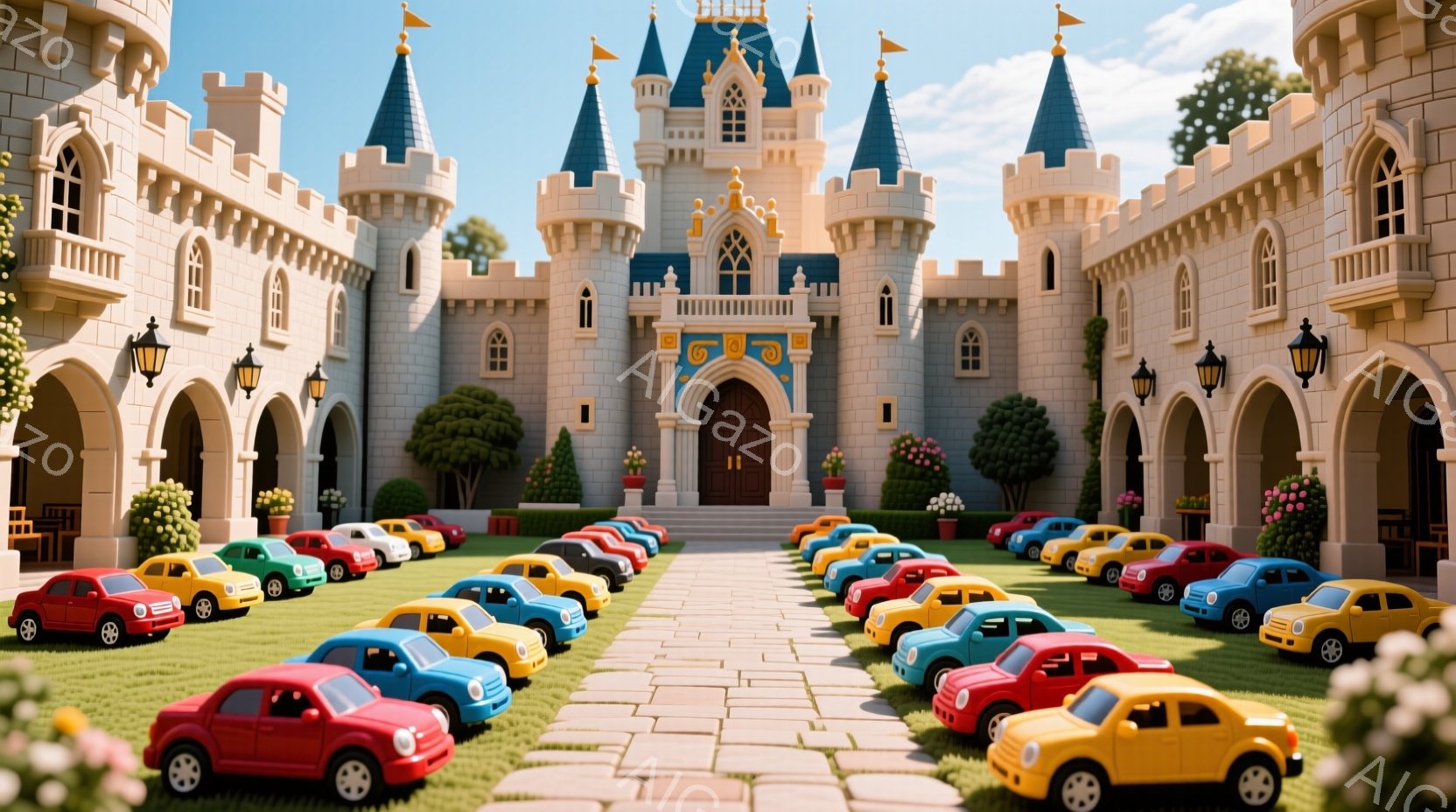 広大な敷地に、カラフルなミニカーが整然と並べられています。背景には、おとぎ話に出てくるような美しい城がそびえ立ち、緑の木々がアクセントとなっています。晴れた空の下、ミニカーと城が組み合わさり、夢のような雰囲気を作り出しています。