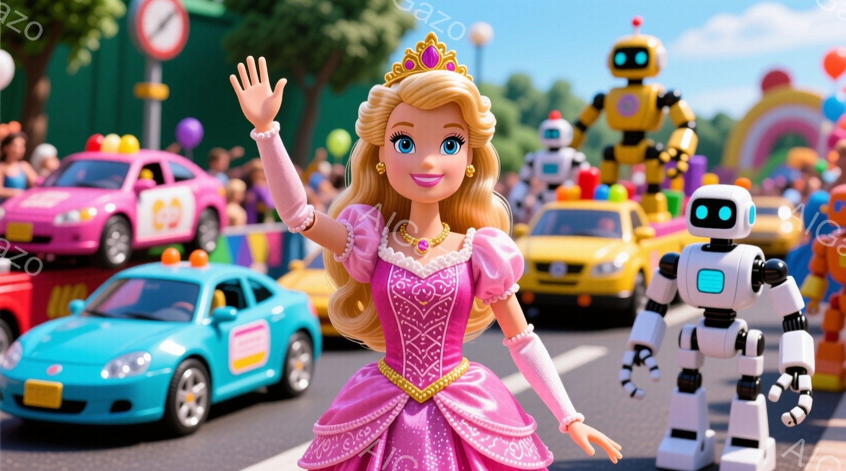 ピンク色の豪華なドレスと金色の髪飾りをつけた女性が、手を振って笑顔を見せています。背景には、カラフルな車やロボット、そしてお祝いを祝う人々の群衆が写っており、お祭りやパレードのような賑やかな雰囲気が漂っています。建物はカラフルでファンタジー風であり、全体的に陽気で活気に満ちた様子が表現されています。