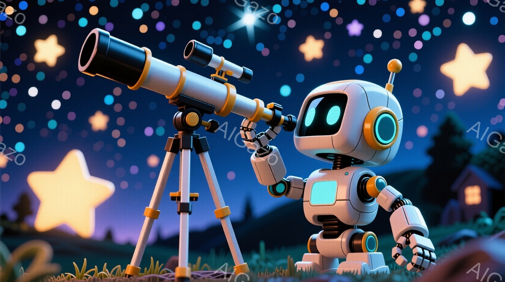 金色の三脚の上に設置された望遠鏡を覗き込んでいる、可愛らしいロボットが描かれています。ロボットは白とオレンジ色の配色で、丸い目と小さなアンテナが特徴的で、好奇心に満ちた表情を見せています。背景には、星が輝く夜空と、青い屋根の可愛らしい家、緑の丘が広がっており、夢幻的な雰囲気を醸し出しています。