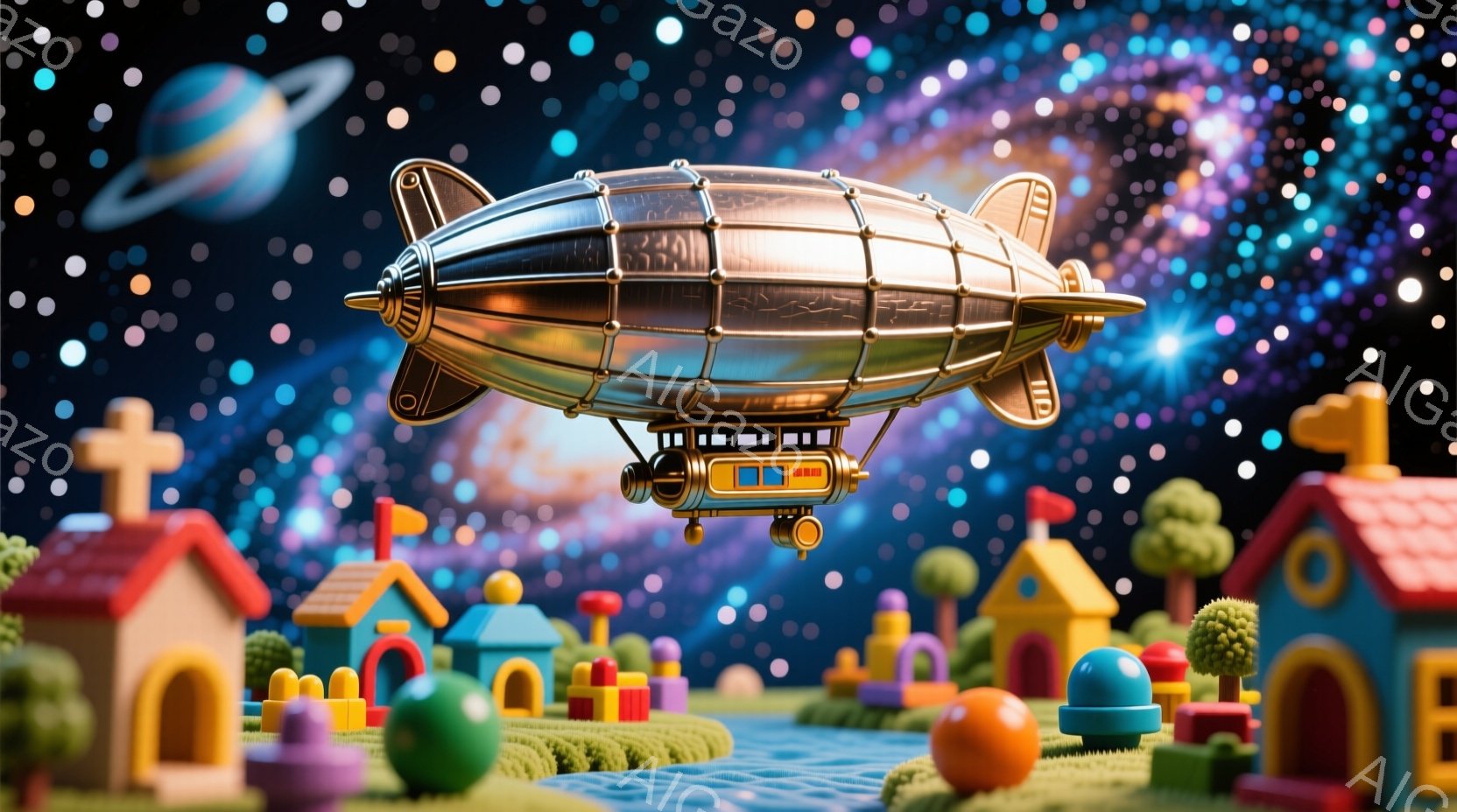空には、金属的な質感の飛行船が浮かんでおり、鮮やかな色彩の可愛らしい家々が並ぶ村の上をゆっくりと進んでいます。村は緑豊かな草地と水路に囲まれ、まるで子供のおもちゃのようなカラフルな建築物とキノコ型の建物が特徴的です。背景には星空が広がり、まるで夢の中のような幻想的な雰囲気を醸し出しています。