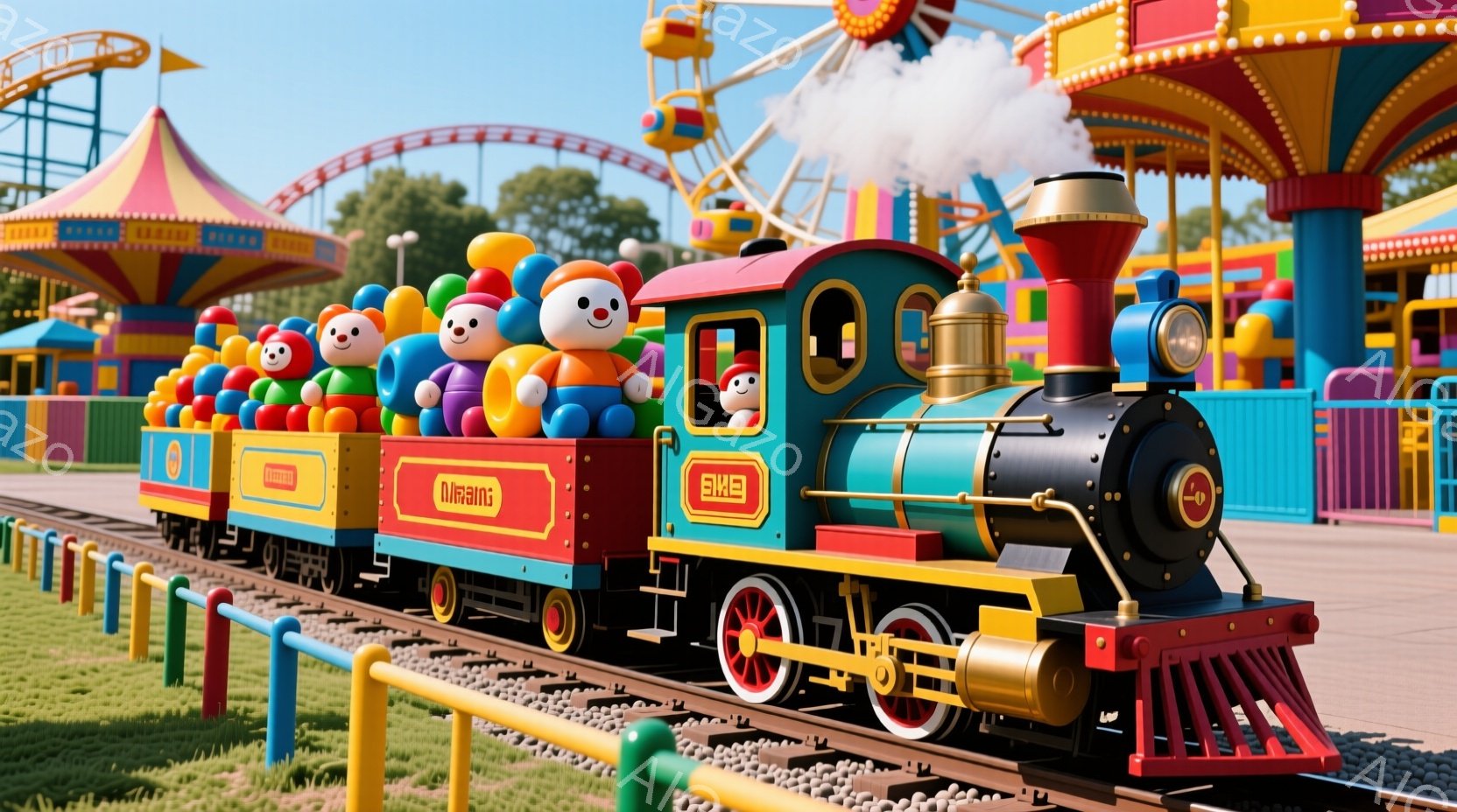 カラフルな遊園地の列車が線路を走っている様子が描かれています。列車の運転席には、赤い帽子をかぶった男の子が笑顔で座り、列車全体が色とりどりのボールや建物で飾られています。背景には、観覧車やカラフルな建物が見え、晴れた空の下、明るく楽しい雰囲気が漂っています。