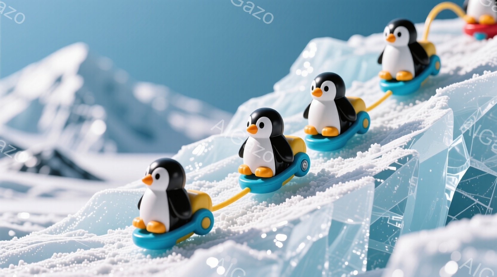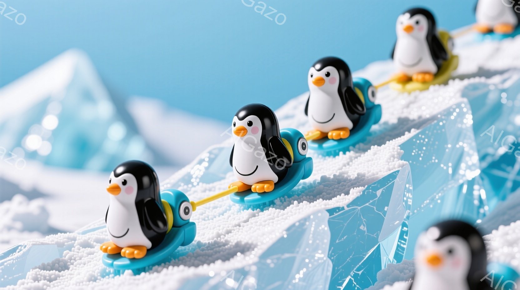 白い背景に、かわいらしいペンギンのフィギュアが3羽、カラフルな乗り物に乗って並んでいます。ペンギンたちはオレンジ色の足と、つぶらな瞳を持ち、楽しそうな表情をしています。背景には氷の結晶のような模様と、青い空が広がっており、全体的に明るく遊び心のある雰囲気です。