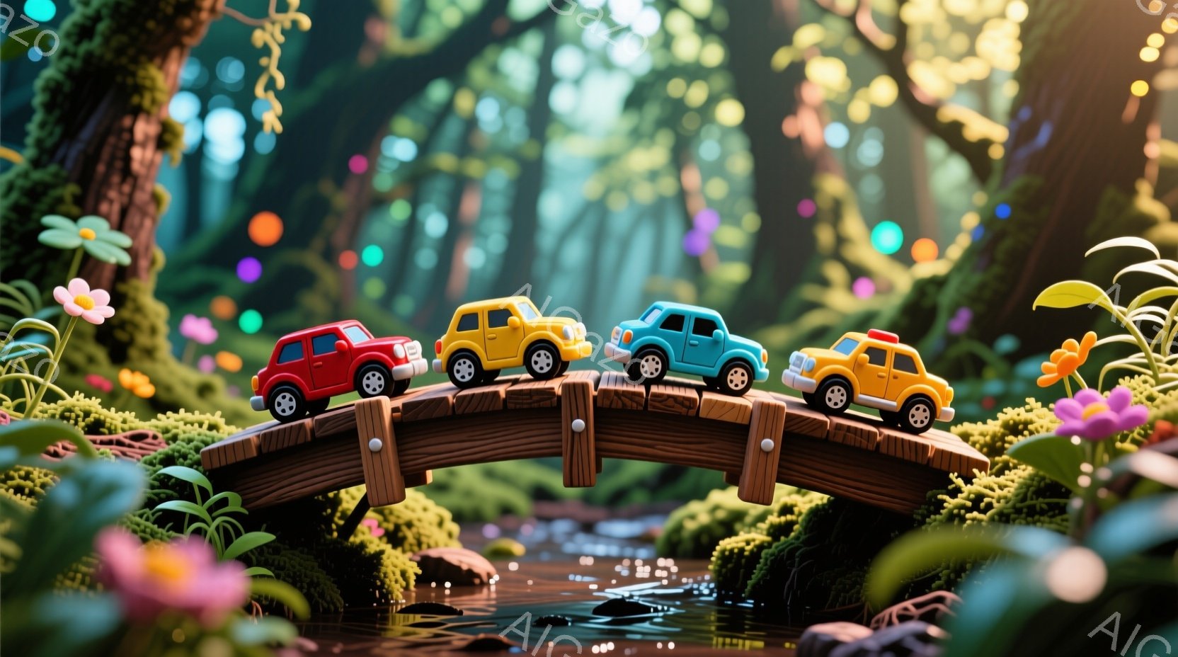 古びた木の橋の上を、黄色、ターコイズ、赤、黄色の小さな車が並んで走っている様子が描かれている。背景には緑豊かな森林と、水面がキラキラと輝く小川が広がり、周囲にはカラフルな花々が咲き乱れている。全体的に、温かく、幻想的な雰囲気で、まるで童話の世界のような光景である。