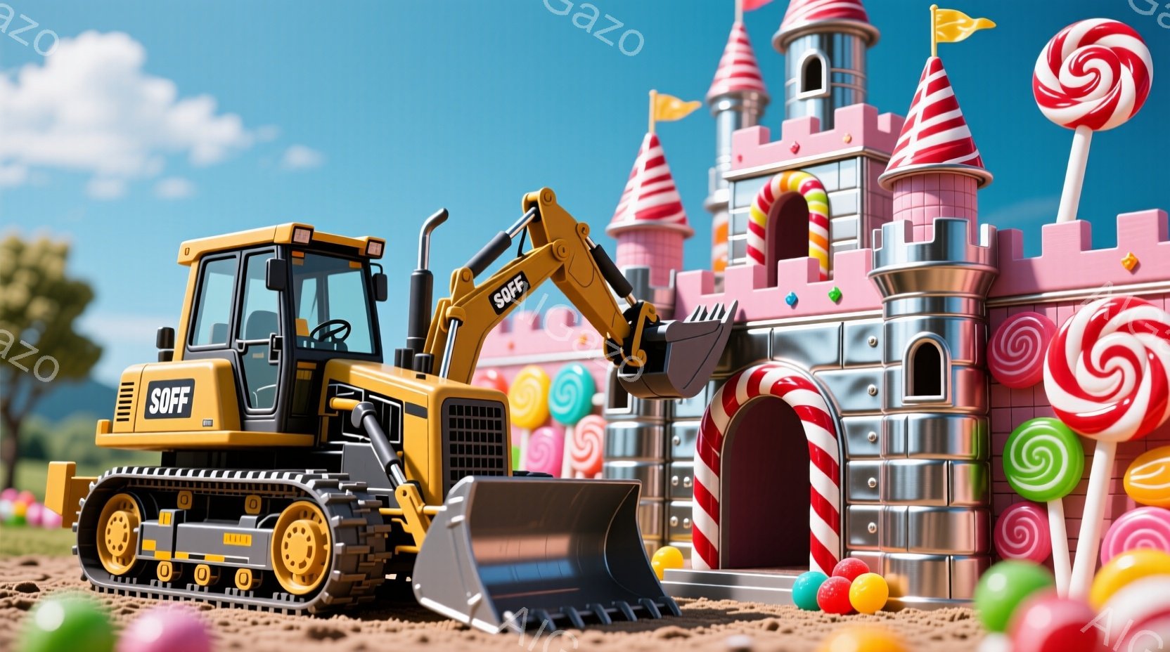 広々とした緑の芝生の上に、建設用ブルドーザーが置かれており、鮮やかなキャンディーの城が背景に聳えています。空は晴れで、巨大なキャンディーが芝生に散らばり、おとぎ話のような雰囲気を作り出しています。ブルドーザーはオレンジ色で、建設現場のような様子と、甘いお菓子の世界が混ざり合った、奇妙で楽しい光景です。