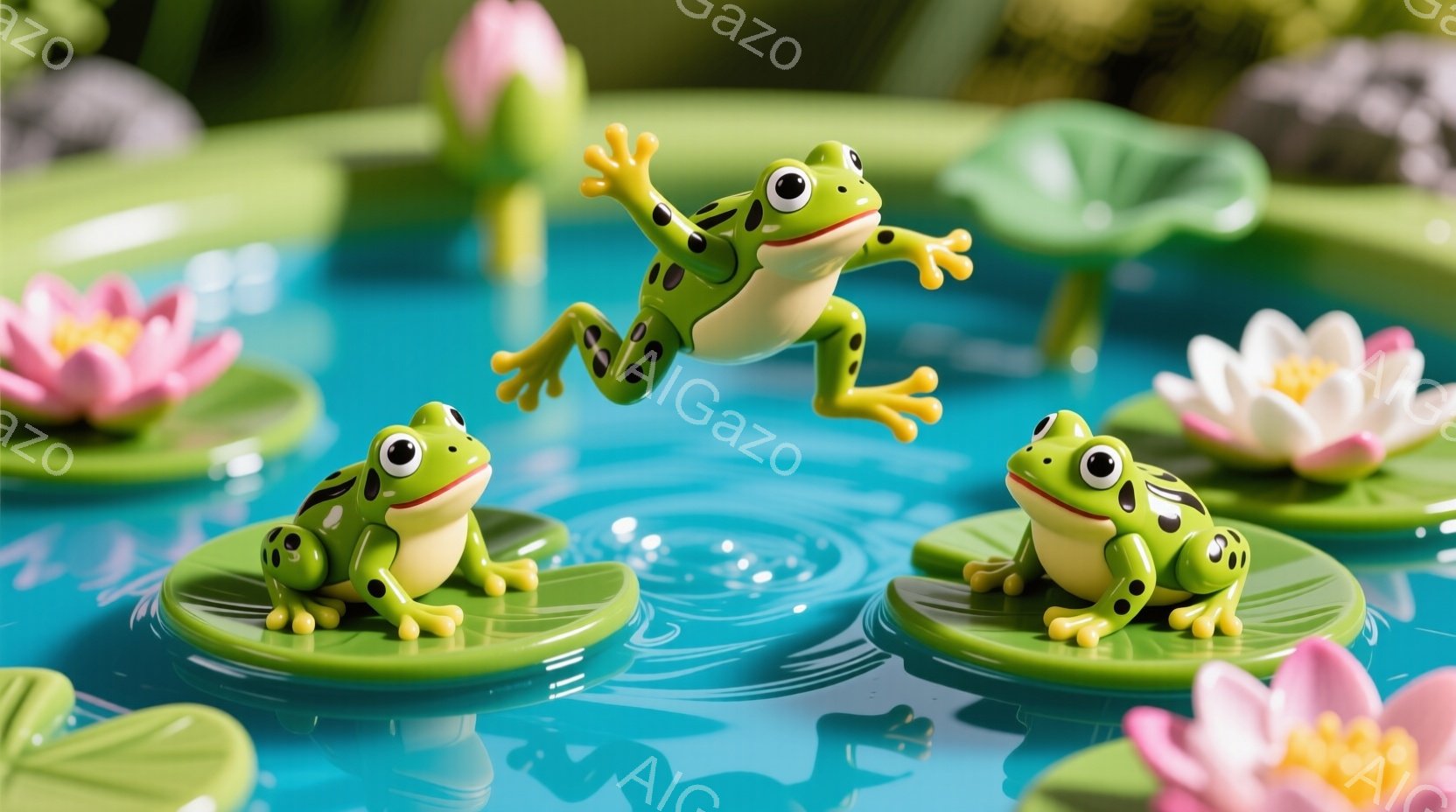 鮮やかな緑色のカエルが、水面に浮かぶ蓮の葉の上で楽しそうに飛び跳ねたり、座ったりしています。カエルたちは水玉模様があり、可愛らしい表情をしています。背景には、水面と蓮の花、そして緑の植物が見え、穏やかで楽しい雰囲気を醸し出しています。
