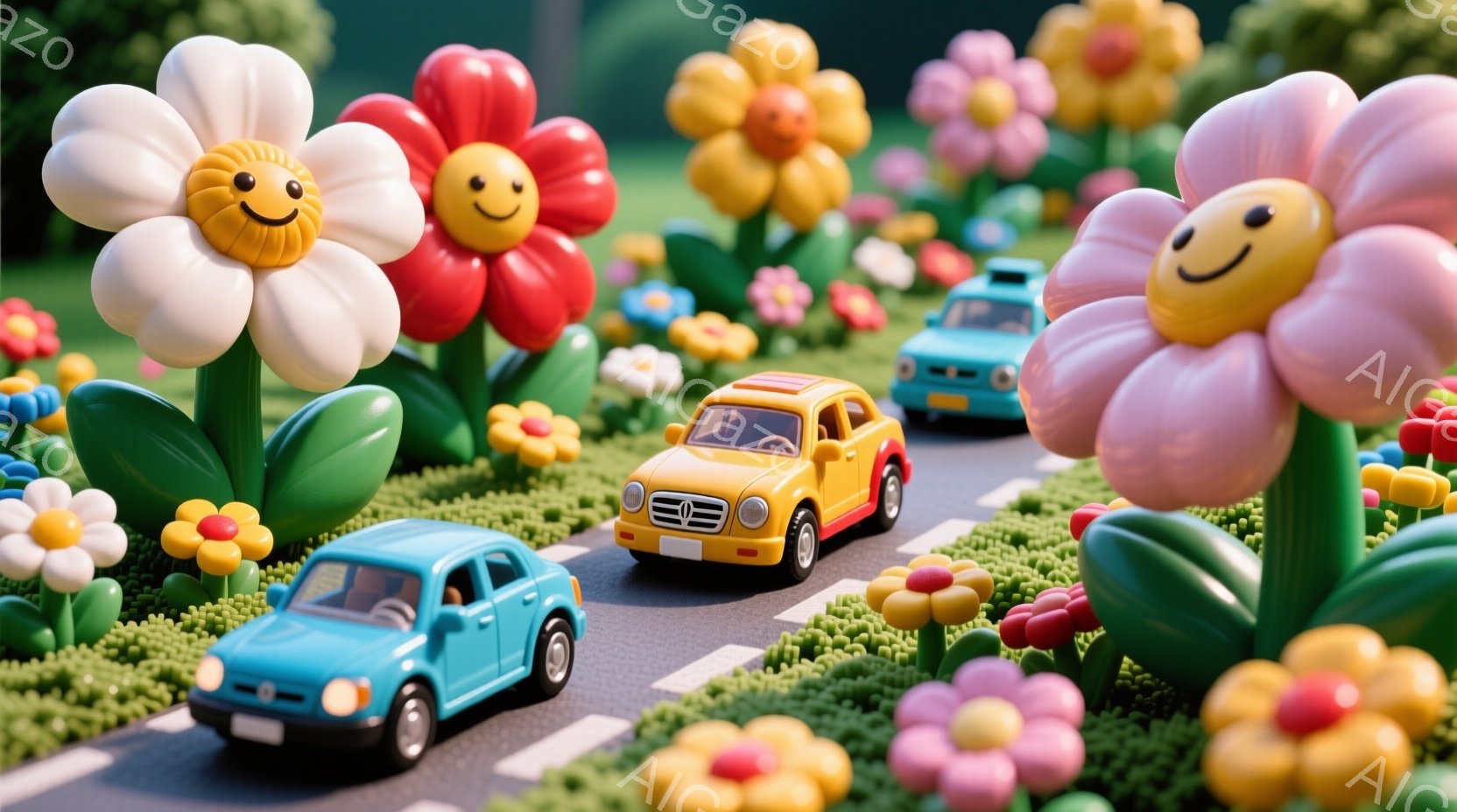 カラフルな玩具の車が、大きな笑顔のついた花々が生い茂る道を走行している様子が描かれています。花々はピンク、赤、白、黄色と多様な色合いで、道沿いに密集して咲き誇り、まるで夢のような世界を表現しています。全体的に明るくポップな雰囲気で、子供向けの楽しい世界観が感じられます。