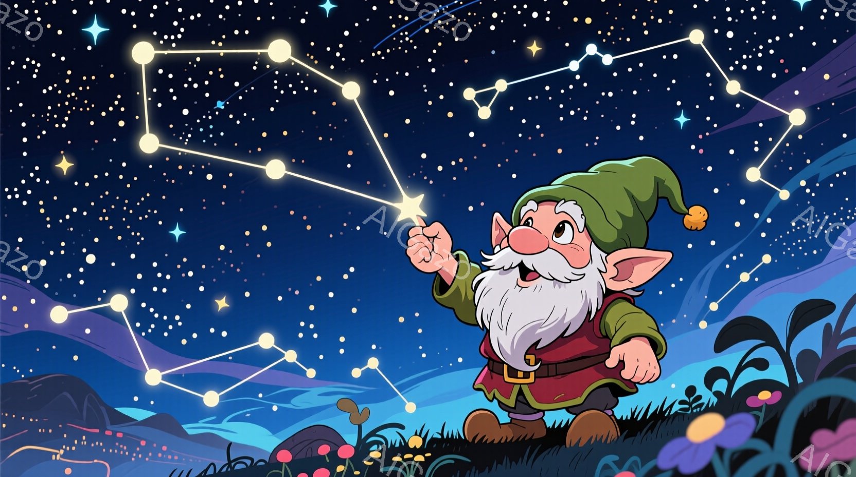 アニメーションスタイルで作られたもので、夜空を見上げる古風の妖精が描かれています。彼は長髪で白髭があり、小さな体格をしており、左手に星の形状を作っています。背景には夜空や星が描かれ、草や花などの自然要素も含まれています。画像全体としては、穏やかでファンタジー的な雰囲気が感じられる作品です。