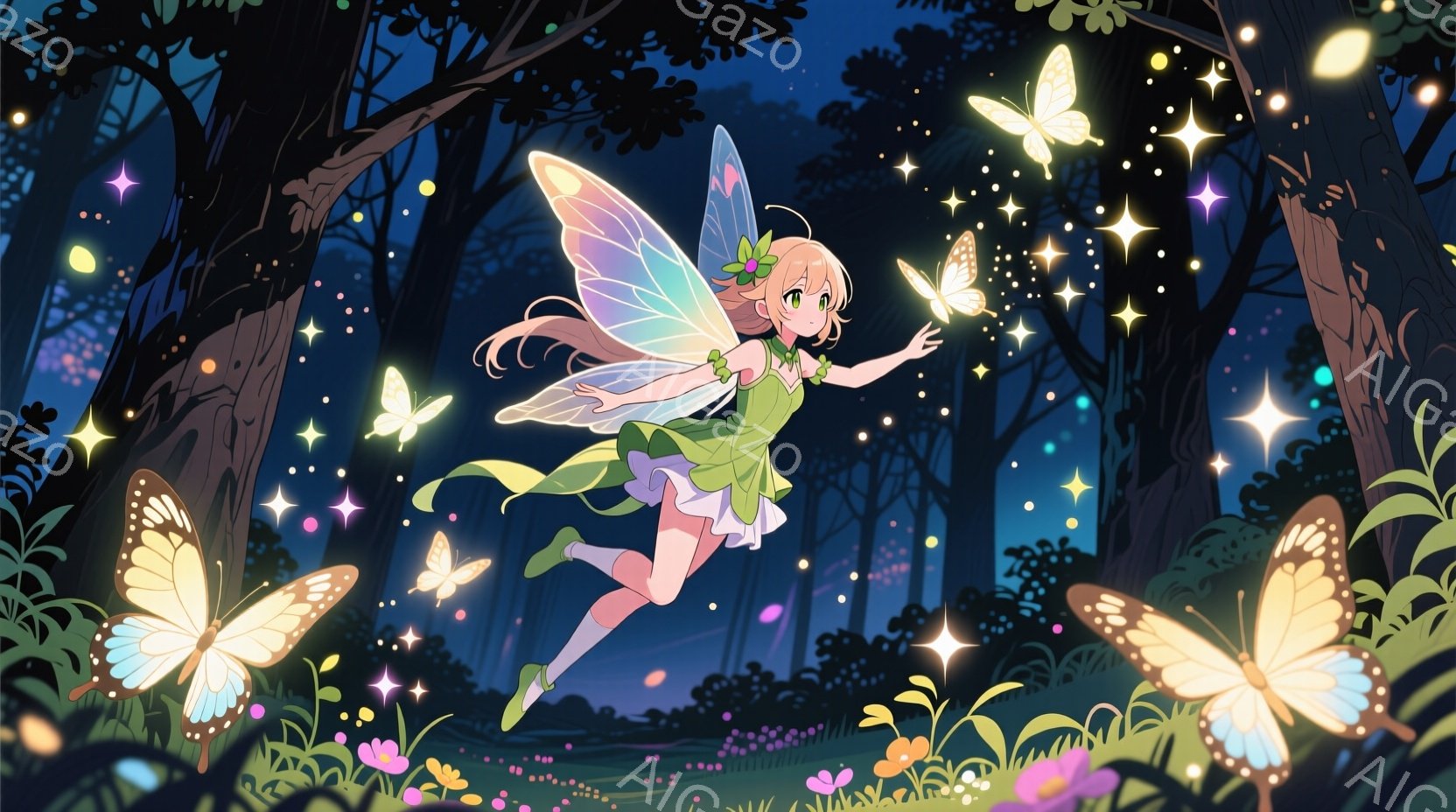 金髪の少女は、緑色のドレスと透明感のある羽を身につけ、夜の森の中で軽やかに舞っている。彼女は微笑みを浮かべ、片手を伸ばして、周りを飛び交う色とりどりの蝶々と触れ合っている。背景には暗い木々が生い茂り、きらめく光が森全体を幻想的な雰囲気に包み込んでいる。