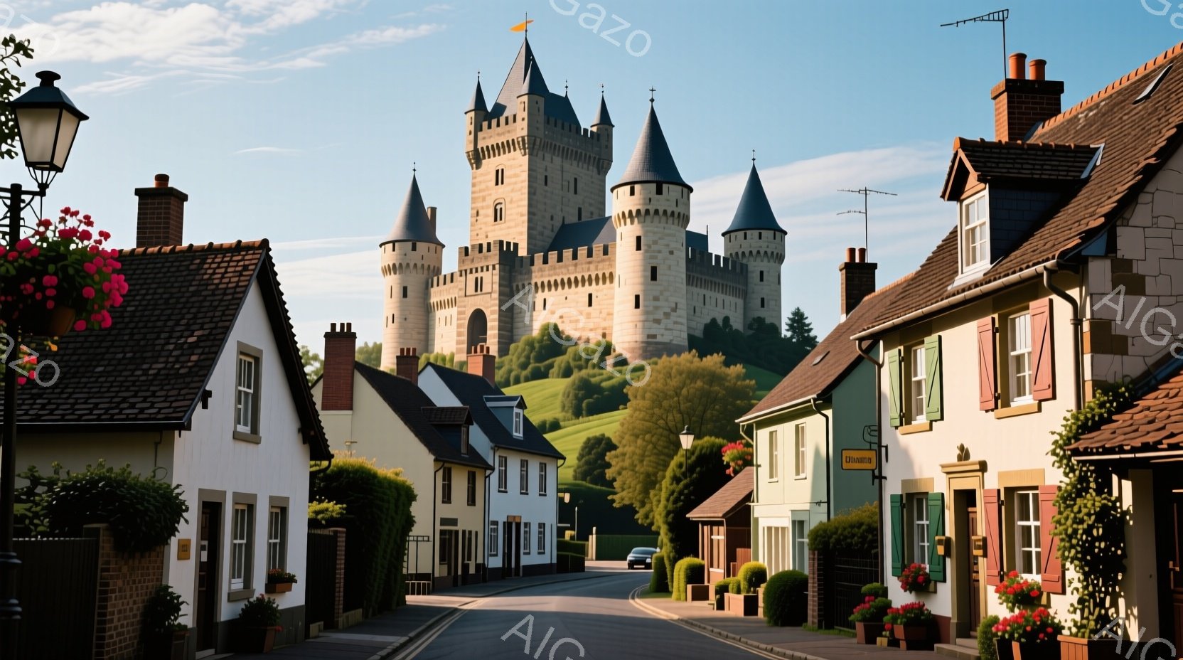 丘の上にそびえ立つ中世の城が印象的な風景です。周囲には可愛らしい家々が並び、緑豊かな木々や花壇が彩りを添えています。晴れた空と穏やかな光が、平和で牧歌的な雰囲気を醸し出しています。
